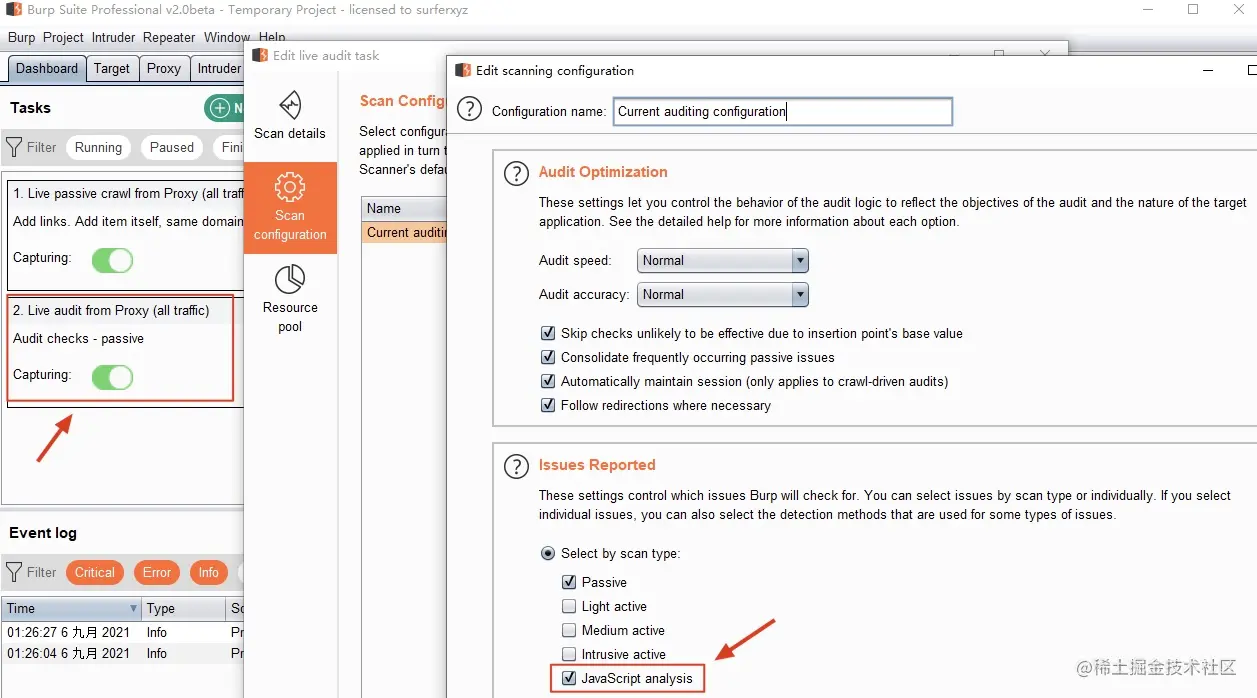 Burp Suite v2.0的Live audit from Proxy被动扫描功能在默认情况下开启JavaScript分析引擎(JavaScript analysis),用于扫描JavaScript漏洞。