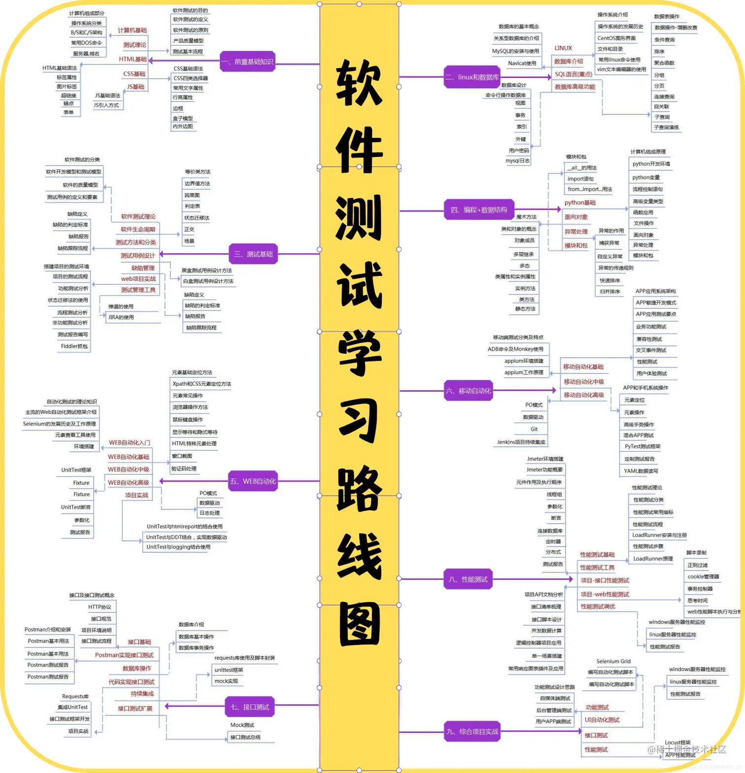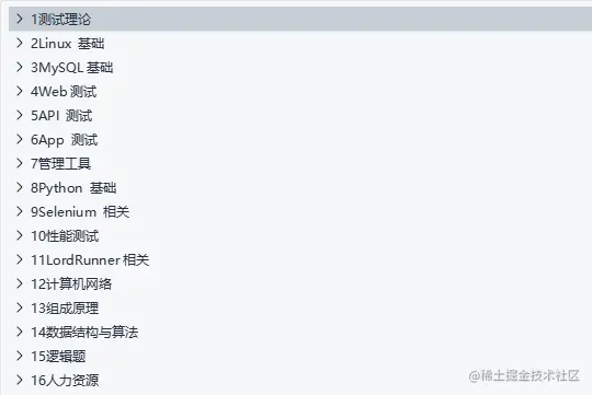测试理论->Linux基础->MySQL基础->Web测试->API测试->App测试->管理工具->Python基础->Selenium相关->性能测试->LordRunner相关->计算机网络->组成原理->数据结构与算法->逻辑题->人力资源