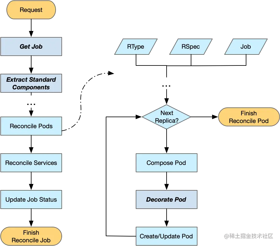 - 首先是进一步提高 Kubeflow Training Operator 适配定制化需求 Job 时的灵活性。我们计划提出与深度学习训练框架解耦的一种 Job API 以支持更广泛的任务定义,并允许用户可以借助 kubeflow/common 中的 controller.v1 和 reconciler.v1 进行定制化开发,但其学习成本和开发成本依然过高。甚至在将来,初级开发者可以不修改 operator 而仅仅添加/修改一些 webhook 或是 decorator server 来实现定制化修改。