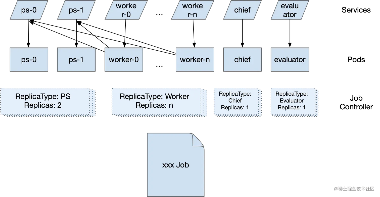 TF_CONFIG)以及创建相关 Kubernetes 资源(如 Service) - 监控并更新整个任务的状态