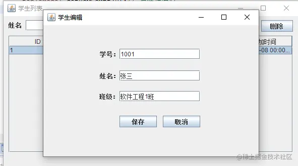 5.数据库连接完成之后,就是数据库的操作了,这里包含三个操作,学生列表的查询,学生信息的添加保存到数据库,和学生信息的修改保存,数据库操作代码如下:
