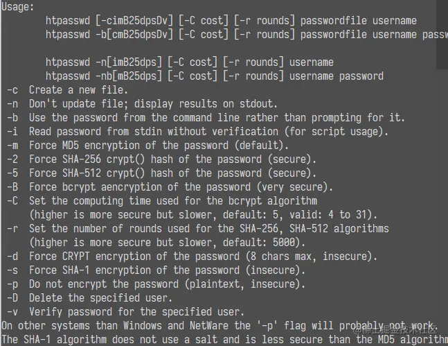 可以看到htpasswd总共有4种加密算法,分别是MD5、bcrypt、CRYPT、SHA,在httpd-tools 2.2的版本中,默认使用的是CRYPT加密算法来进行密码加密的,而httpd-tools 2.4的版本中,默认是使用MD5来进行密码加密的