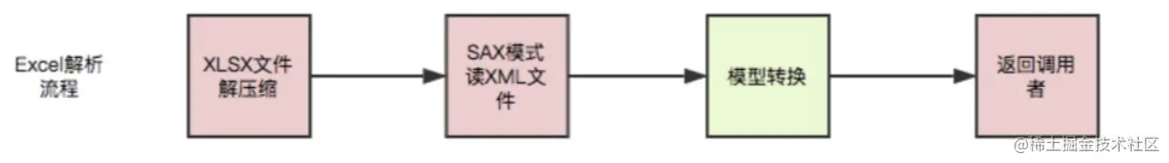 与POI 不用的是,EasyExcel主要是采用sax模式一行一行解析,并将一行的解析结果以观察者的模式通知处理,即使数据量较大时也不会发生OOM,以下是其执行流程图