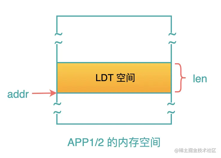 例如:现在系统中有 2 个用户程序: APP1 和 APP2,操作系统在加载每一个应用程序的时候,就会在应用程序自己的内存空间中,申请一块,用作 LDT: