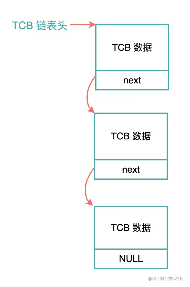 每一个应用程序需要一个 TCP 结构,所有的 TCB 结构就可以构成一个链表,便于操作系统来管理。