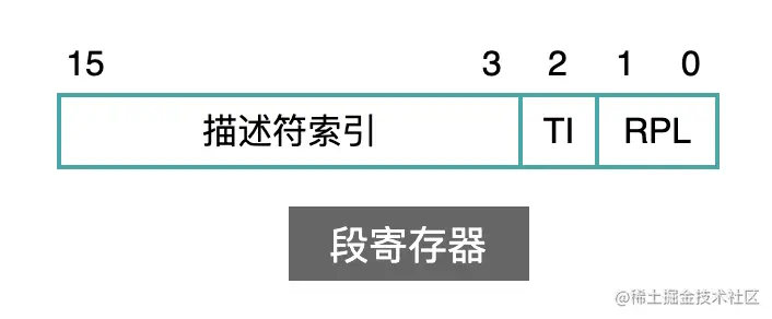 因此,我们需要纠正之前的错误:段寄存器中,不仅仅有段的索引号,还有另外两个属性:TI 和 RPL,如下图所示: