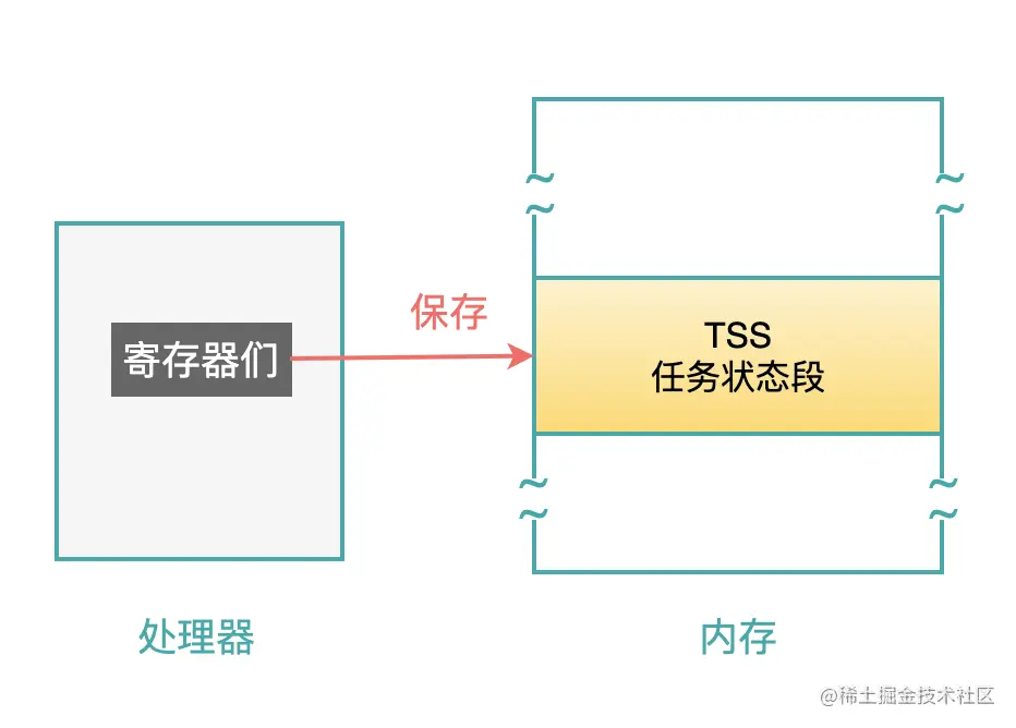 首先,把处理器中的寄存器内容,存储到 TR 寄存器指向的 TSS 段中(即将被停止的任务);