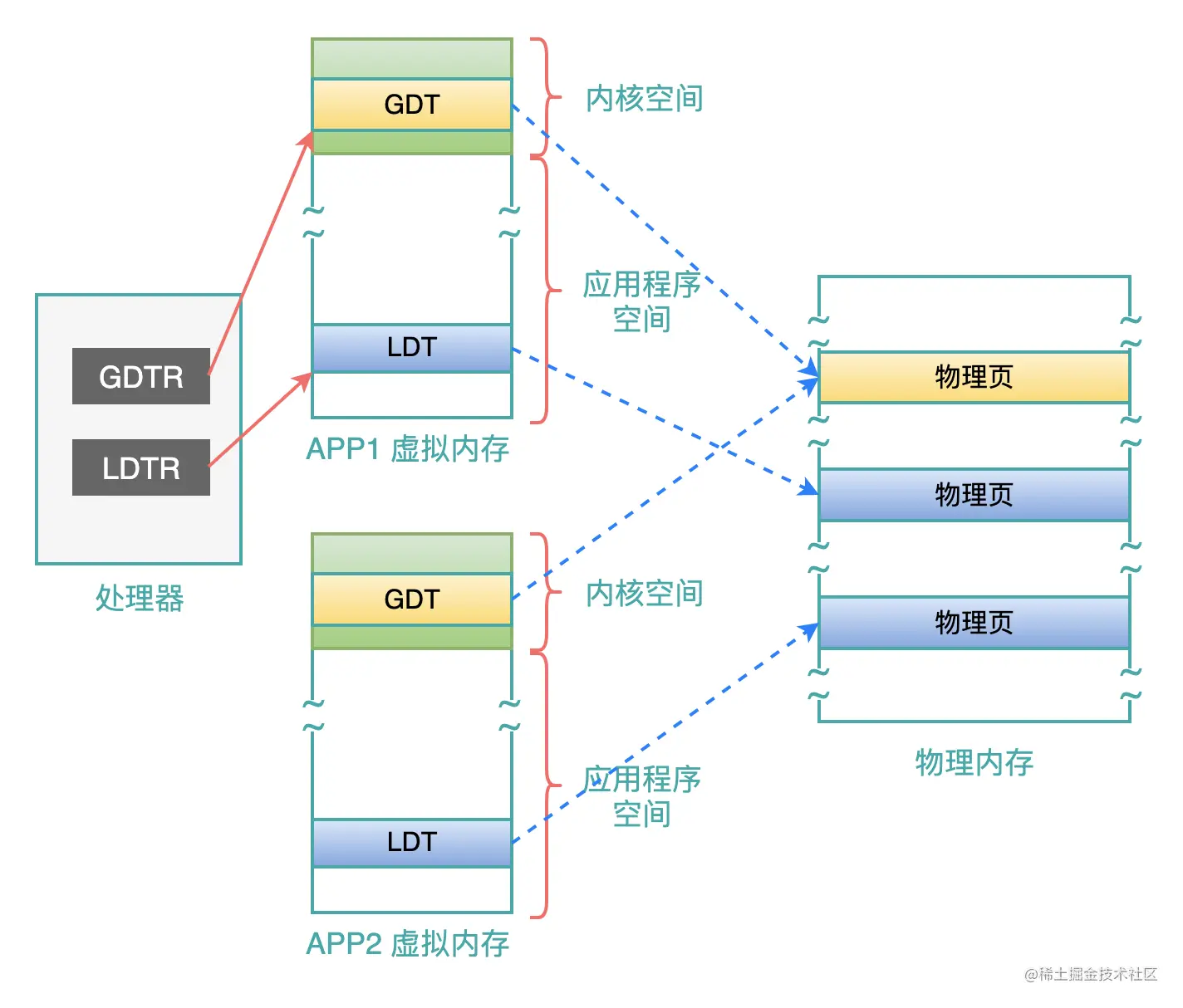 当操作系统切换到应用程序2时,处理器中的 LDTR 就会被赋值为应用程序2 的 LDT 的线性地址和长度信息。