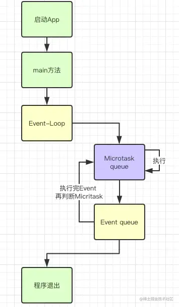 我们在上面有提到,每一个isolate相当于一个完全独立的dart执行环境,那么当前的环境中如果存在一些任务,如果完全按照顺序执行,岂不是会因为某个任务处理的时间过于久,后面的任务来不及执行?在单线程语言中,如果不做任何处理,的确会出现这种问题,熟悉js的人都知道js的异步操作很优秀,原因在于js有着不错的事件驱动进行任务调度,提高任务执行的效率,尤其是最近热门的node.js,更是把事件驱动做到极致,而dart作为一个优秀的单线程语言,自然不可能缺少事件驱动这个优秀的特性,在dart中事件驱动是存在于isolate中的,也就是说,我们每一个新的isolate都有一个独立的完整的event-loop,而每一个Loop中又包含了两个队列,其中一个队列叫microtask queue(微任务队列) ,该队列的执行优先级最高,而另外一个队列event queue(事件队列) 属于普通的事件队列,两个队列依靠着固定的执行流程完成了整个的dart任务执行机制,事件驱动的执行流程图如下: