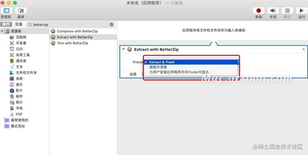 首先我们打开自动操作工具中的“Extract with BetterZip”选项,可以看到可选的预置项只有下图1的三个选项,因此我们要做的就非常简单了。增加一个适合我们需求的预设设置不就可以了吗?