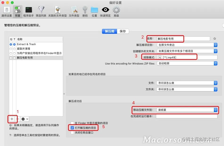 接下来我们要新增加一个解压预设设置,点击“加号”按钮,然后输入预设名称为“解压电影专用”;在排除模式中选择“正则表达式”,然后输入排除除了mp4格式以外其他格式文件的正则表达式,这里我们演示时,只对mp4类型电影进行解压;一般来说我们解压后解压包也不需要了,因此我们直接设置移动压缩文件到“废纸篓”;最后勾选上“打开解压缩的项目”,自动打开解压后文件夹。