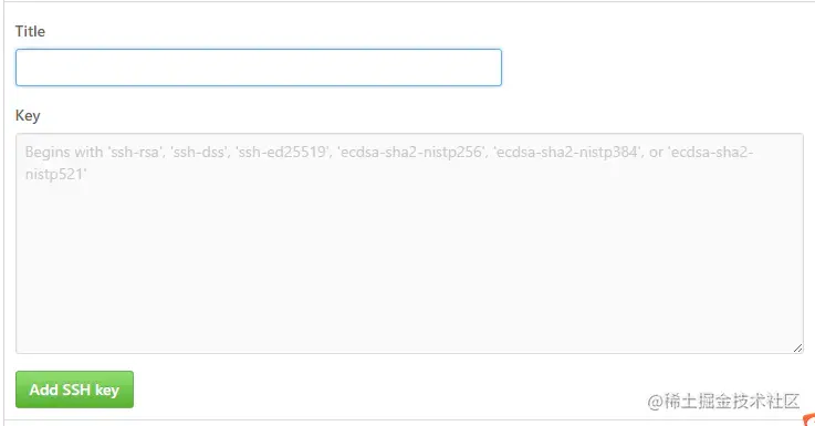 点击New SSH key:添加一个title(自己定义),在key中填写C:\Users\你电脑的 用户名.ssh\id_rsa.pub文件中的密钥,点击Add SSH key即可。
