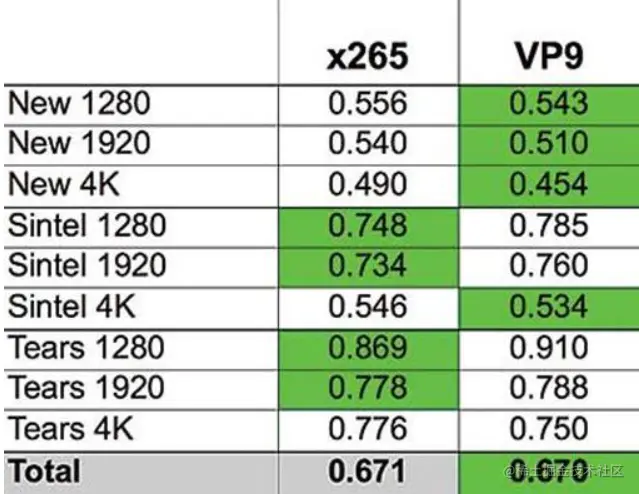 从我们对两种编码进行测试的结果上看,VP9和H.265在编码质量上区别并不明显,整体平均分只差了 0.001,在实际应用中几乎不存在差异。而由于VP9和H.265采用的宏块结构计算,使得他们能够提供更加有效的图像分解机制,尤其在低比特率下,VP9和H.265的图像能够比H264更加详细和清晰。