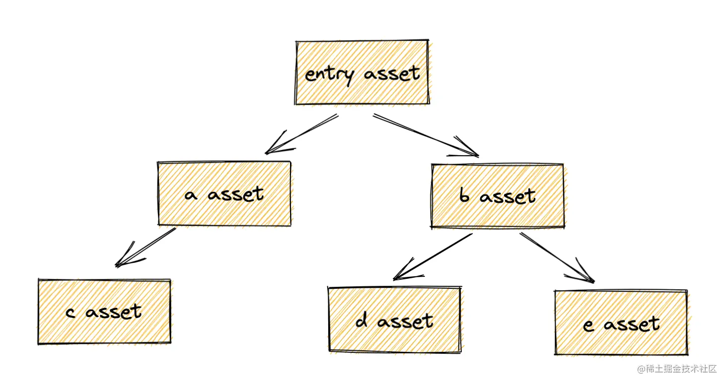每个asset可以通过模块间依赖关系找到依赖的模块,重复这一过程,生成新的asset,最终形成整个应用所有asset间的依赖关系: