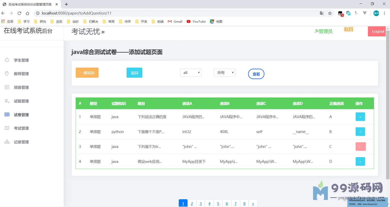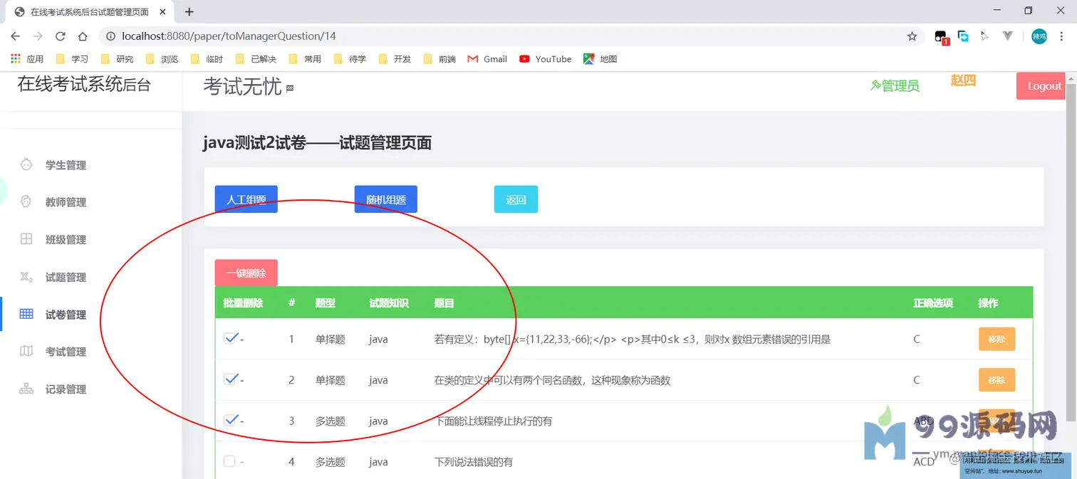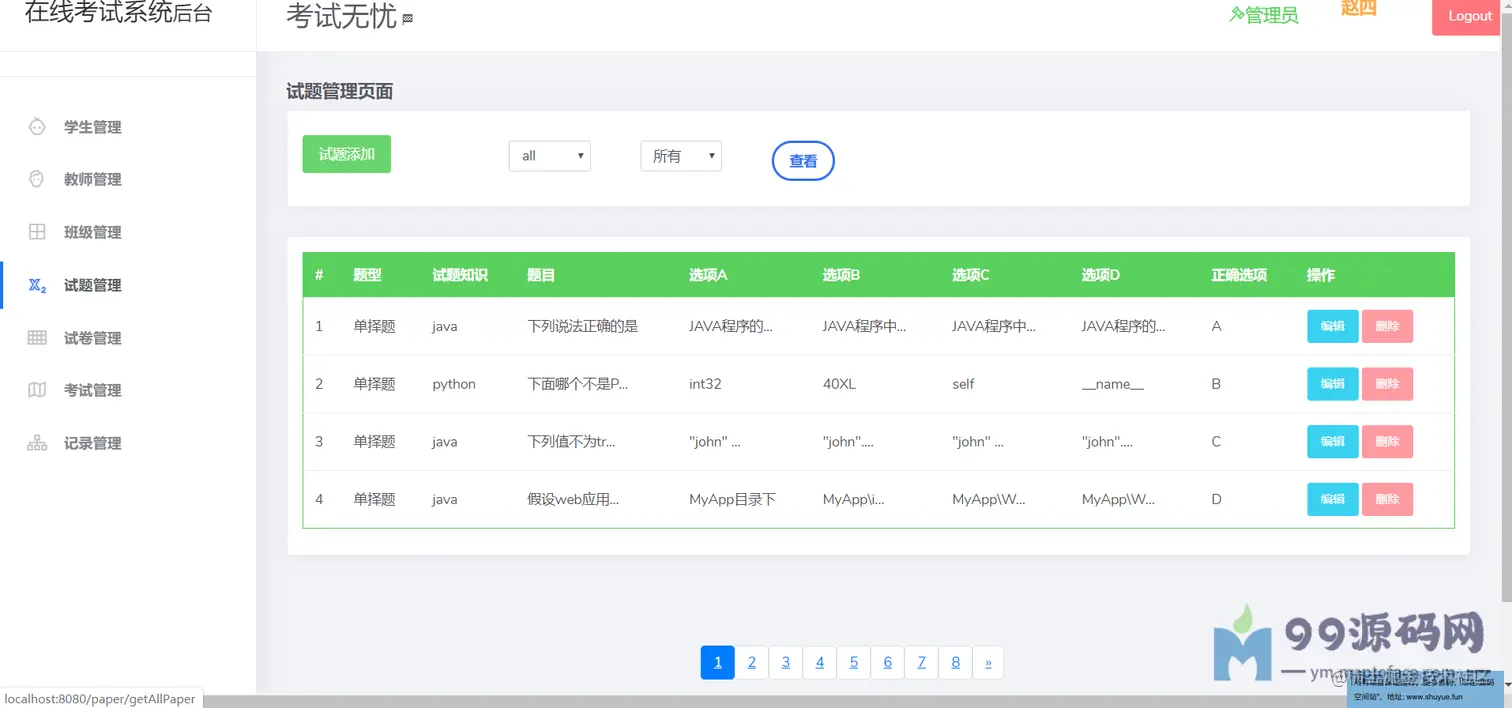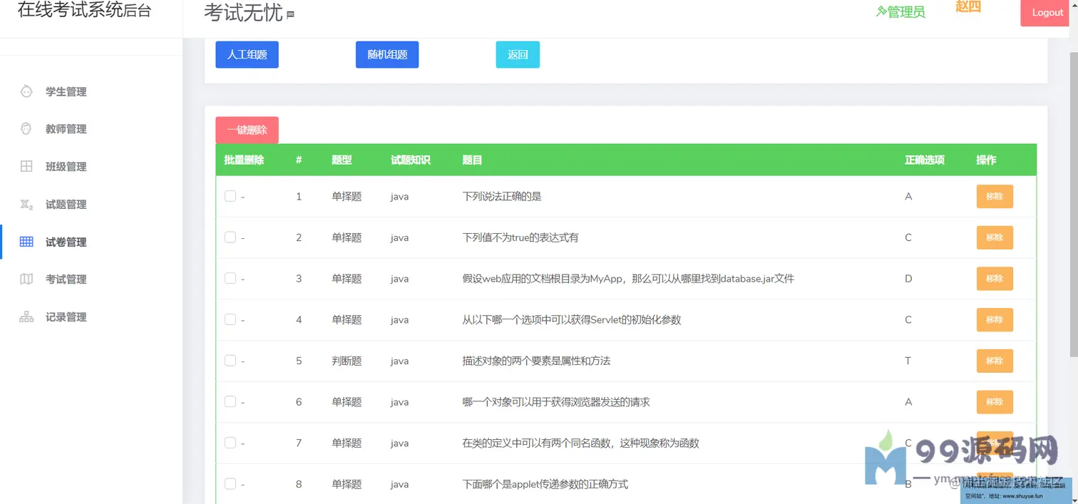 5. 试卷管理:试卷的主体是试题,然后用户能对试卷停止增删改查操作。