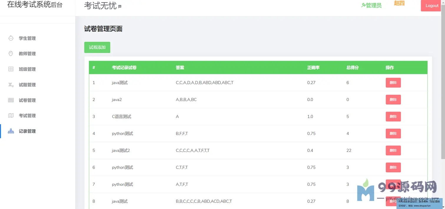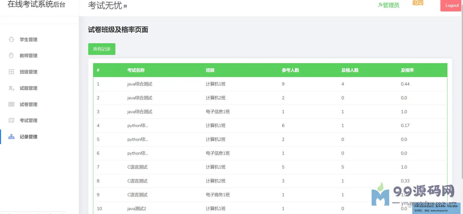 7. 记载管理:查看试卷的考试状况;以班级为单位依据班级考试状况生成每个考试的不同班级的及格率以便当排名。