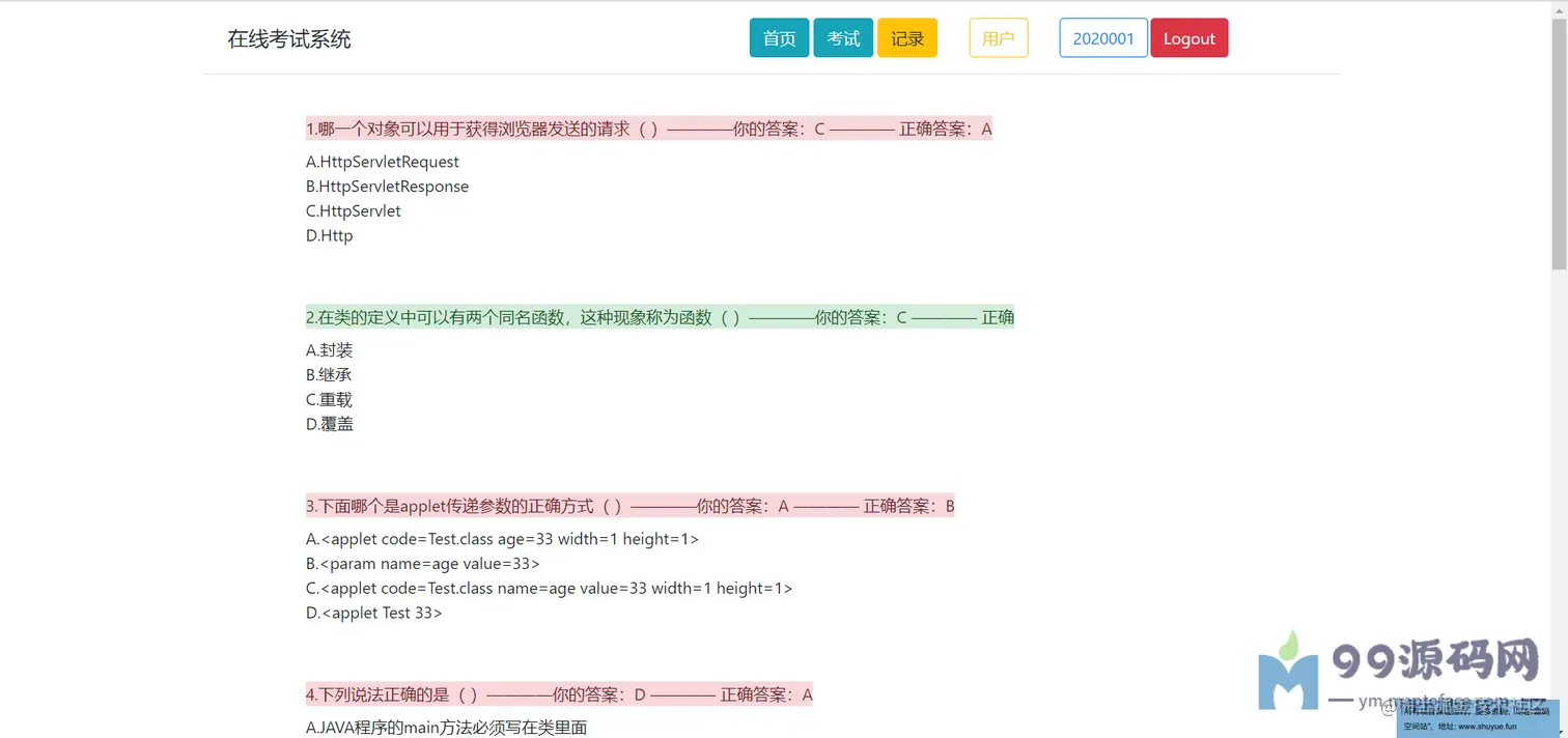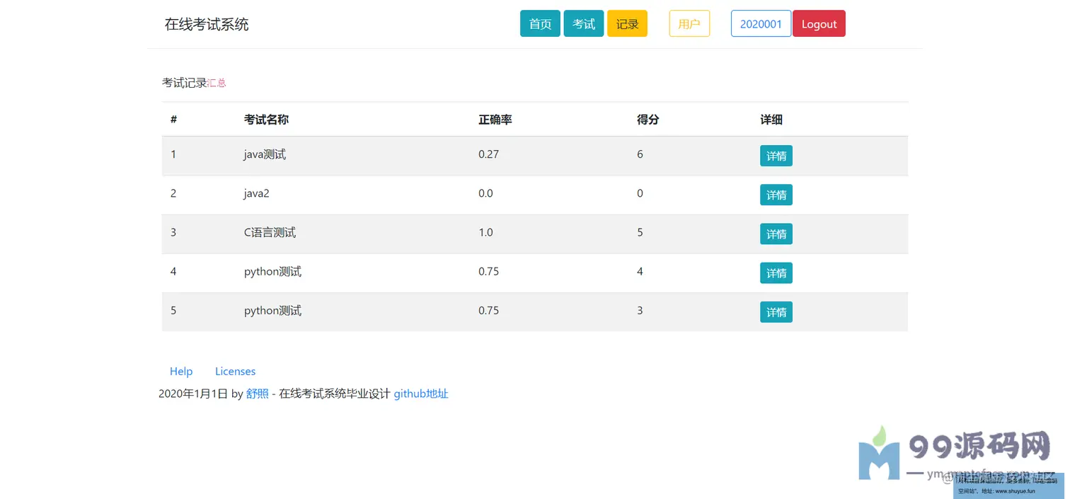 3. 查询历史考试状况:学生在考完试后系统便会记载它的考试得分,停止精确率的剖析,并提供试卷详情查看,且这此的考试信息会存入数据库中以便于下次查看。