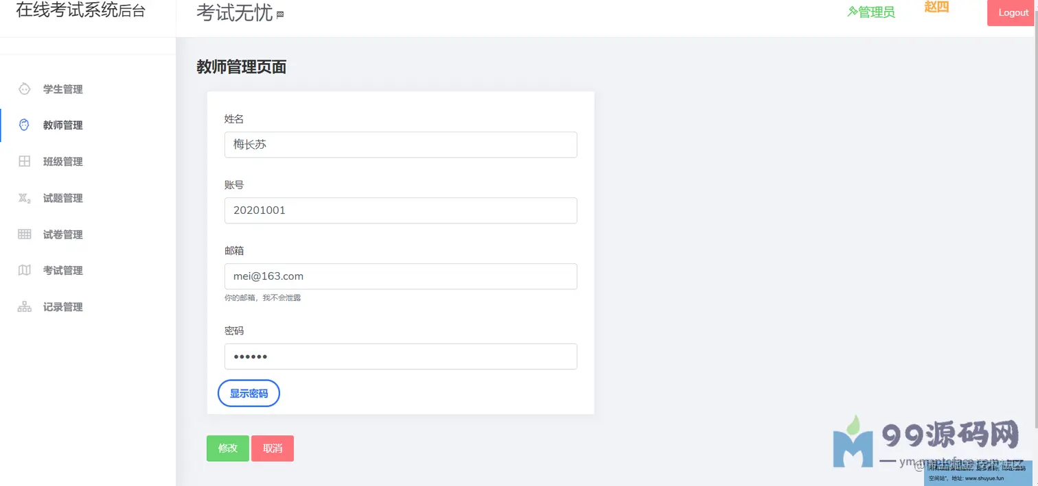 2. 教员管理:查看一切教员的根本信息(除密码外),并修正本人的根本信息,而管理员除了以上功用还能够对一切教员的一切信息停止修正删除操作,也能添加教员。