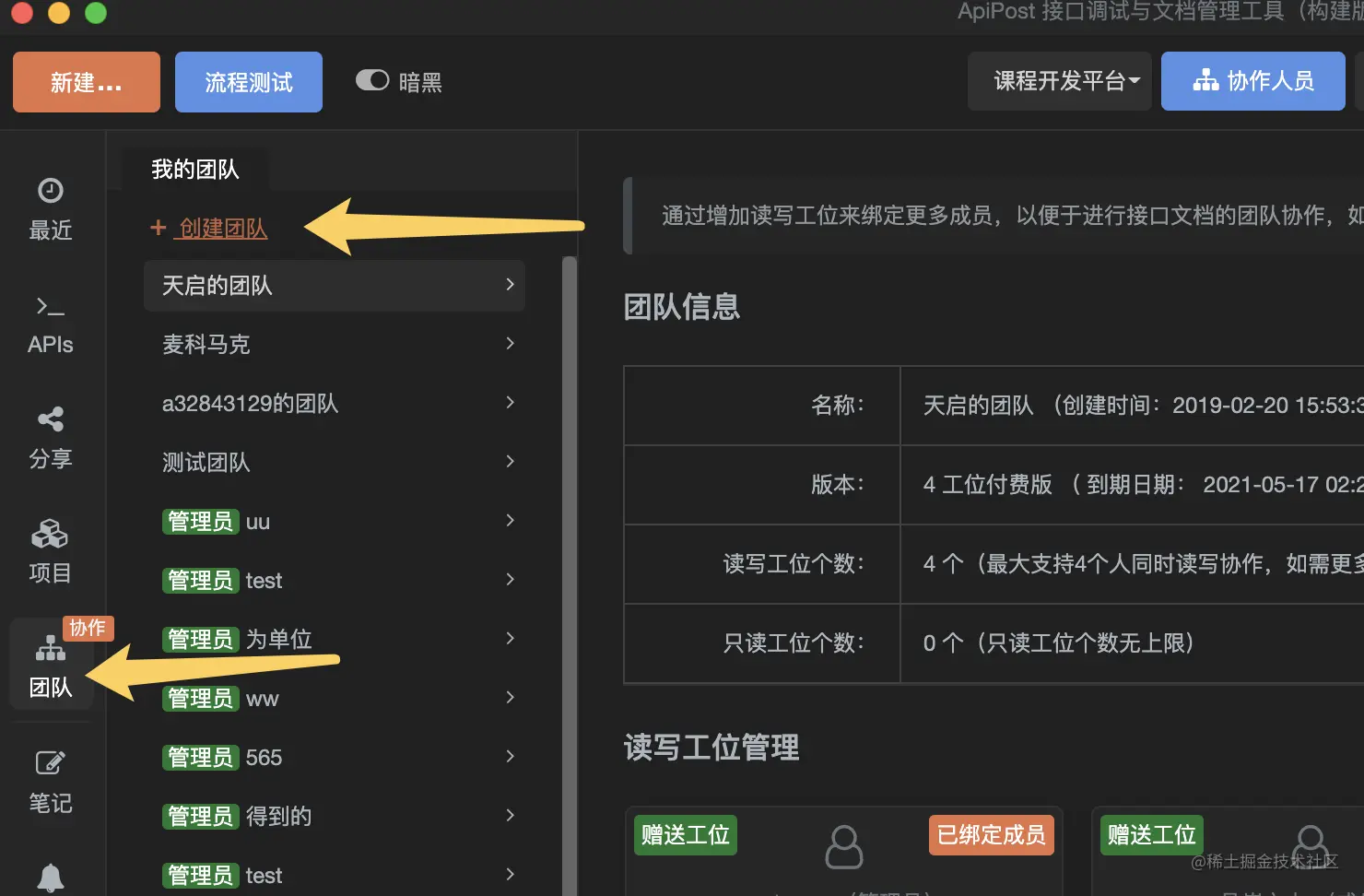 好用方便的开发团队管理工具--apipost z初晴 2021-09-09 143 阅读1分钟 团队的创建和管理 创建团队 针对每一个注册的账号,APIPOST会分配一个系统默认创建的团队。您也可以通过点击左侧的“团队”标签,找到“新建团队”按钮新建一个团队。 删除团队 由于团队涉及的底层操作较多,暂不支持用户自主删除团队。您可以联系APIPOST官方客服进行删除。 退出团队 退出团队的前提是在当前团队下没有参与协作的项目,如果您已解除当前团队下所有项目的协作者关系,那么就可以通过退出工位的操作实现退出团队。