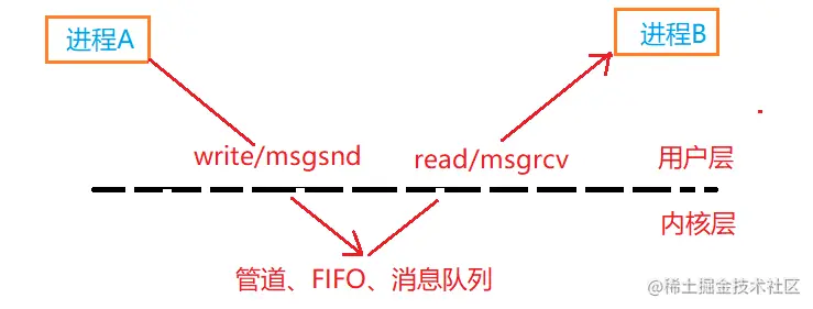 - 发送消息一方,通过系统调用(write或msgsnd)将消息