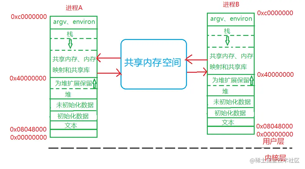 共享内存是所有IPC方式中最快的一种,原因在于:共享内存一旦映射到进程地址空间,进程间数据的传递就不需要涉及内核。