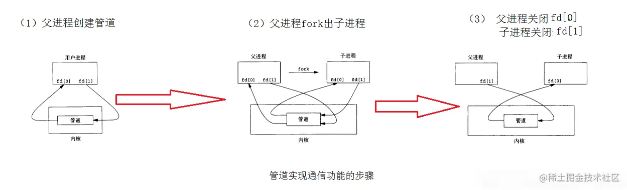 父子进程之间的通信三部曲:(由于 fork 的原因只能在父子和兄弟之间)