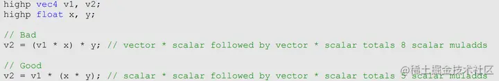 过去很多Shader Core的设计是Vector Based,即ALU只会进行向量的加减乘除,对于标量也会规约到向量运算。基于这类设计,就有一些奇技淫巧,去把一个计算尽量向量化[17]。但现在更多的是Scalar Based的Shader Core,所以也就无需太过关注这点,但是,我们还是应该尽量延迟向量和标量之间的运算,比如这个例子: