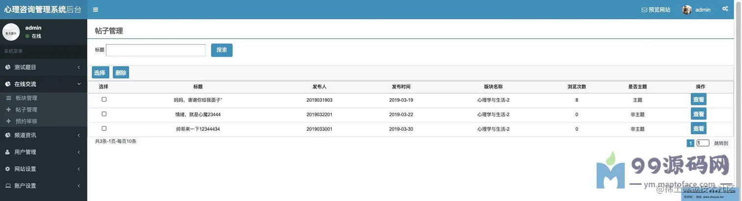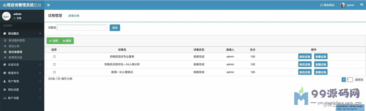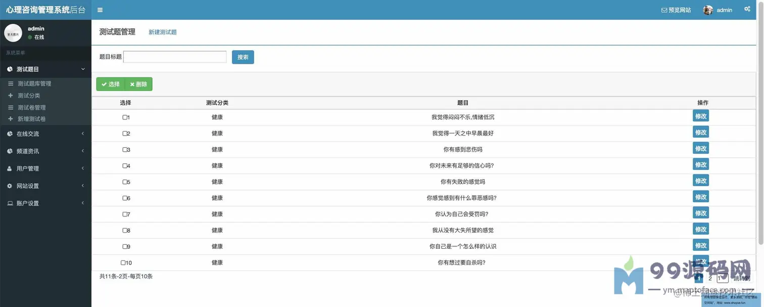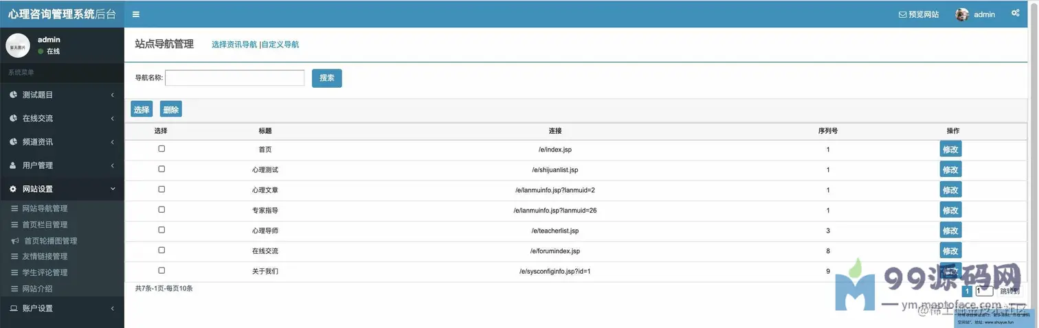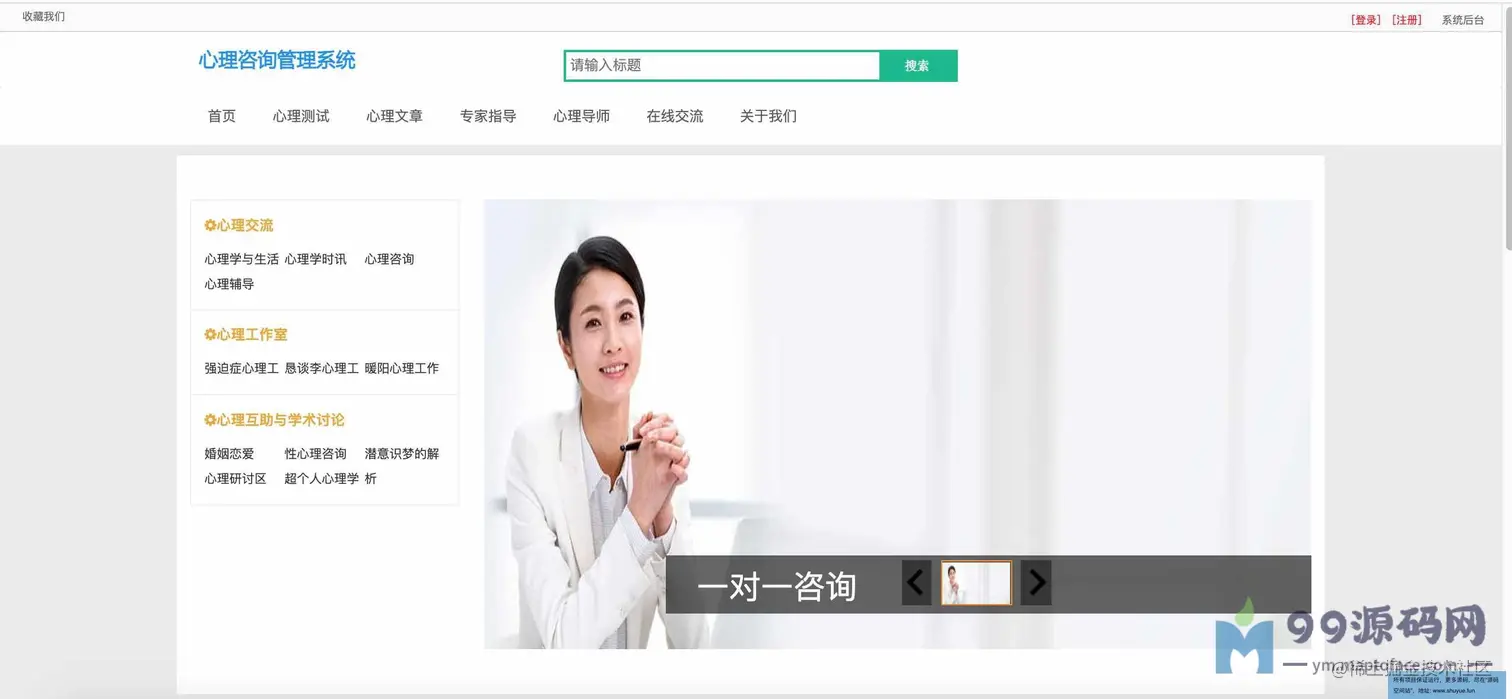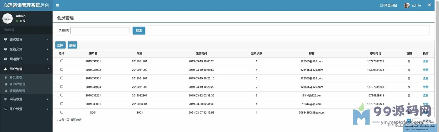 功能介绍 基于SSM校园心理咨询服务平台系统分为学生、教师、管理员三种角色,用户角色主要包括用户注册、用户登录、在线咨询、心理测试、论坛交流、账户维护等,教师角色主要包括教师登录、文章管理、在线回复等;管理员角色主要包括学生管理、教师管理、试题库管理、测试分类管理、试卷管理、新闻管理、网站介绍管理、会员评论管理、轮播图管理、友情链接管理、后台用户管理等最后根据详细设计的结果,运用JavaEE技术平台,使用更灵活的B/S开发模式和经典的SSM组合框架实现系统的MVC分层架构,并结合MySQL数据库实现了大学生心理减压网站的信息化管理。 环境需要 1.运行环境:最好是javajdk1.8,我们在这个平台上运行的。其他版本理论上也可以。 2.IDE环境:IDEA,Eclipse,Myeclipse都可以。推荐IDEA; 3.tomcat环境:Tomcat7.x,8.x,9.x版本均可 4.硬件环境:windows7/8/101G内存以上;或者MacOS; 5.是否Maven项目:否;查看源码目录中是否包含pom.xml;若包含,则为maven项目,否则为非maven项目 6.数据库:MySql5.7版本; 技术栈 1.后端:SpringSpringMVCMyBatis 2.前端:JSP+bootstrap+jQuery 使用说明 1.使用IDEA/Eclipse/MyEclipse导入项目,Eclipse/MyEclipse导入时,若为maven项目请选择maven;若为maven项目,导入成功后请执行mavenclean;maveninstall命令,下载所需jar包; 2.使用Navicat或者其它工具,在mysql中创建对应名称的数据库,并导入项目的sql文件; 3.将项目中db.properties配置文件中的数据库配置改为自己的配置 4.配置tomcat,然后运行项目,输入localhost:8080/xxx登录 5.管理员账户admin密码admin 教师账户:T001密码:123456 学生账户:2019031903密码:123456