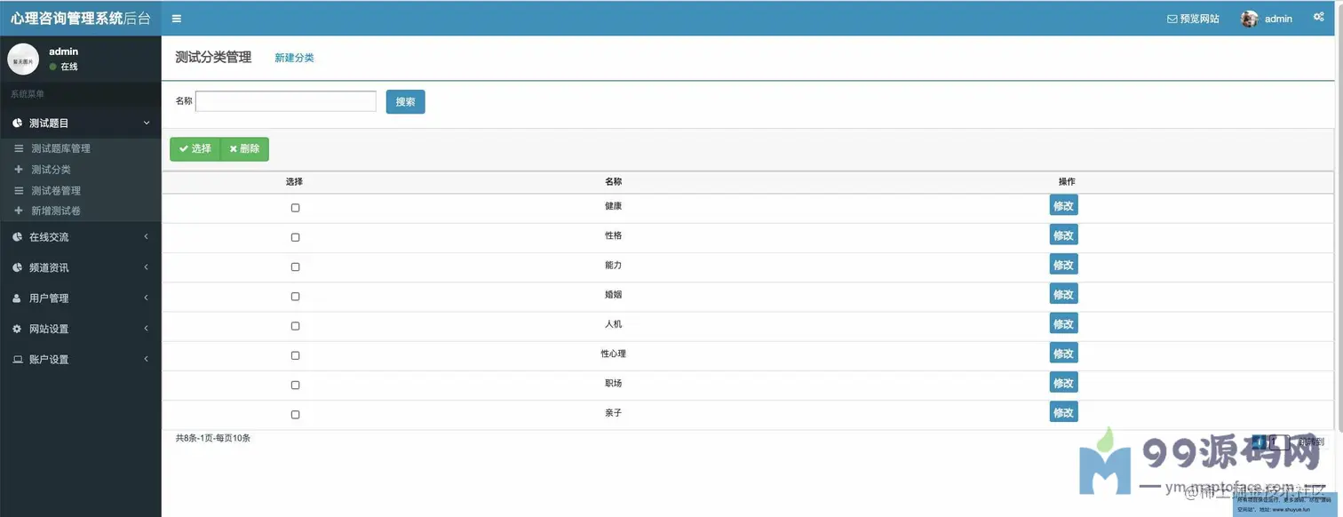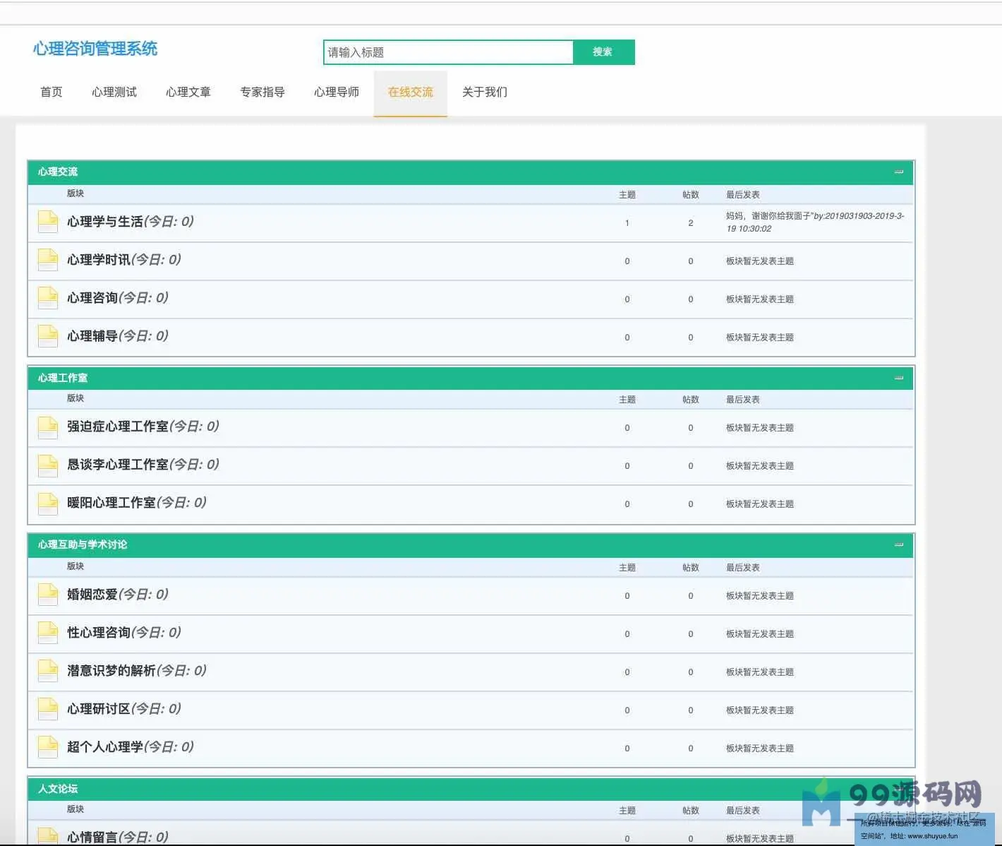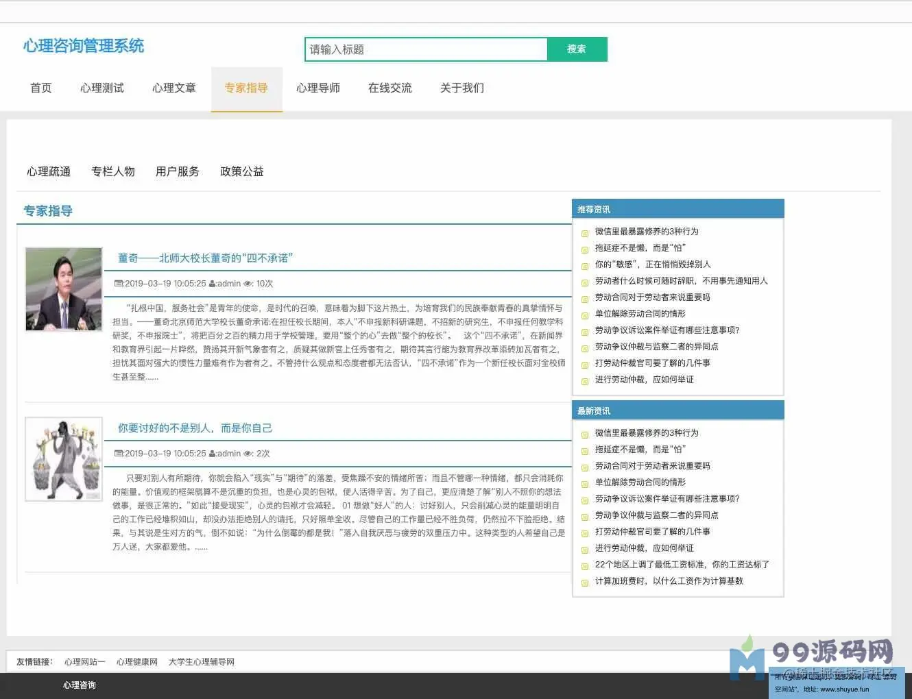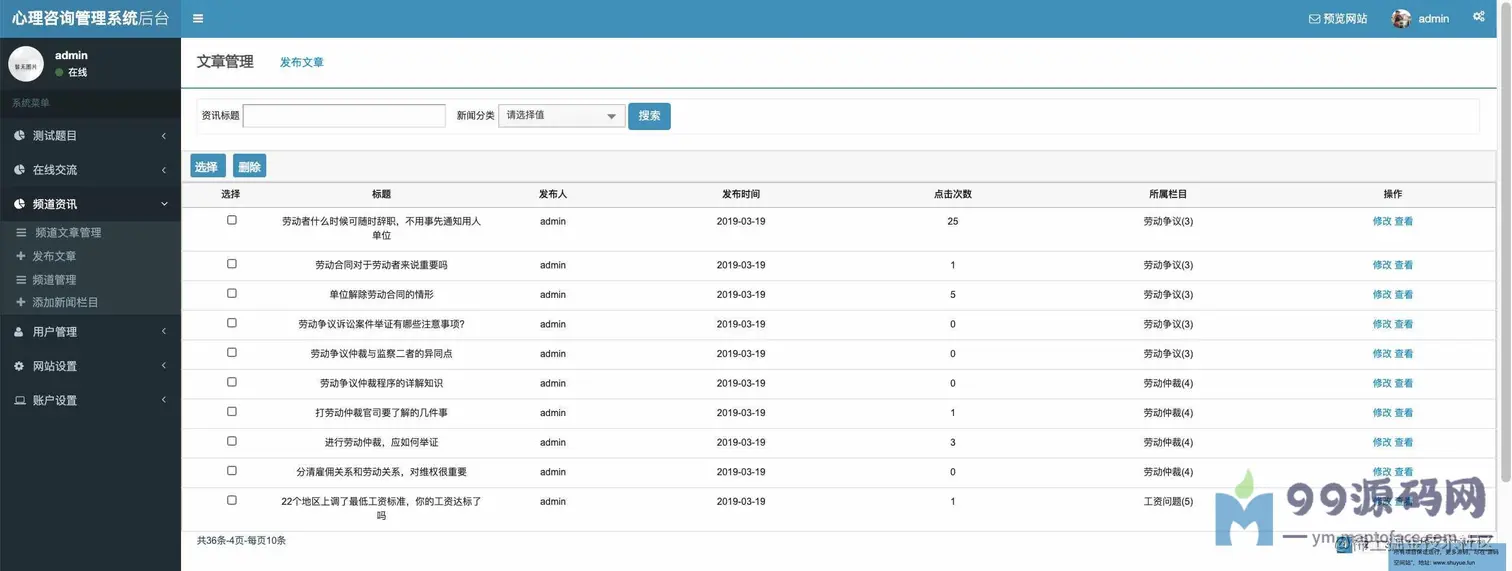 功能介绍 基于SSM校园心理咨询服务平台系统分为学生、教师、管理员三种角色,用户角色主要包括用户注册、用户登录、在线咨询、心理测试、论坛交流、账户维护等,教师角色主要包括教师登录、文章管理、在线回复等;管理员角色主要包括学生管理、教师管理、试题库管理、测试分类管理、试卷管理、新闻管理、网站介绍管理、会员评论管理、轮播图管理、友情链接管理、后台用户管理等最后根据详细设计的结果,运用JavaEE技术平台,使用更灵活的B/S开发模式和经典的SSM组合框架实现系统的MVC分层架构,并结合MySQL数据库实现了大学生心理减压网站的信息化管理。 环境需要 1.运行环境:最好是javajdk1.8,我们在这个平台上运行的。其他版本理论上也可以。 2.IDE环境:IDEA,Eclipse,Myeclipse都可以。推荐IDEA; 3.tomcat环境:Tomcat7.x,8.x,9.x版本均可 4.硬件环境:windows7/8/101G内存以上;或者MacOS; 5.是否Maven项目:否;查看源码目录中是否包含pom.xml;若包含,则为maven项目,否则为非maven项目 6.数据库:MySql5.7版本; 技术栈 1.后端:SpringSpringMVCMyBatis 2.前端:JSP+bootstrap+jQuery 使用说明 1.使用IDEA/Eclipse/MyEclipse导入项目,Eclipse/MyEclipse导入时,若为maven项目请选择maven;若为maven项目,导入成功后请执行mavenclean;maveninstall命令,下载所需jar包; 2.使用Navicat或者其它工具,在mysql中创建对应名称的数据库,并导入项目的sql文件; 3.将项目中db.properties配置文件中的数据库配置改为自己的配置 4.配置tomcat,然后运行项目,输入localhost:8080/xxx登录 5.管理员账户admin密码admin 教师账户:T001密码:123456 学生账户:2019031903密码:123456