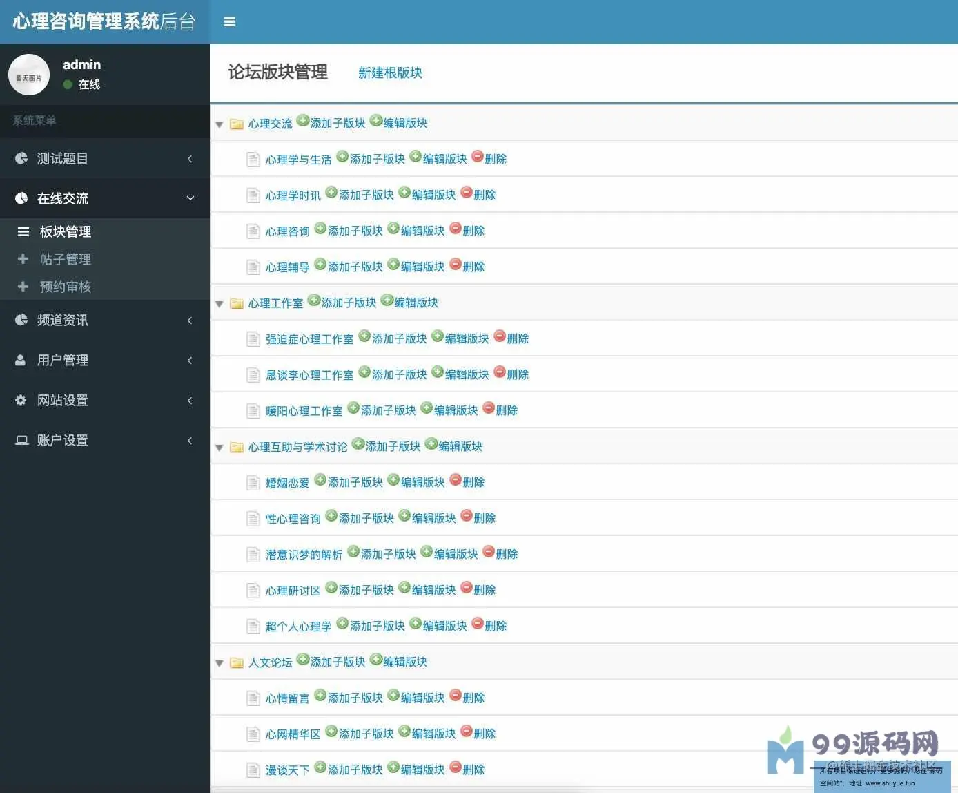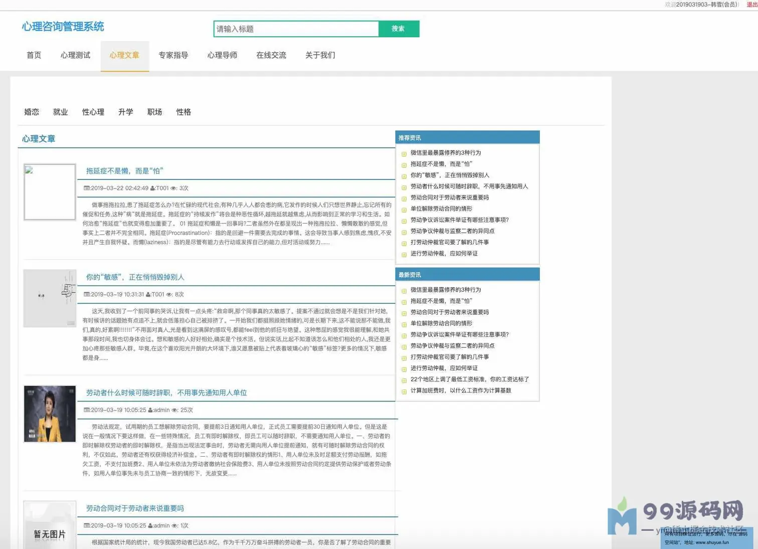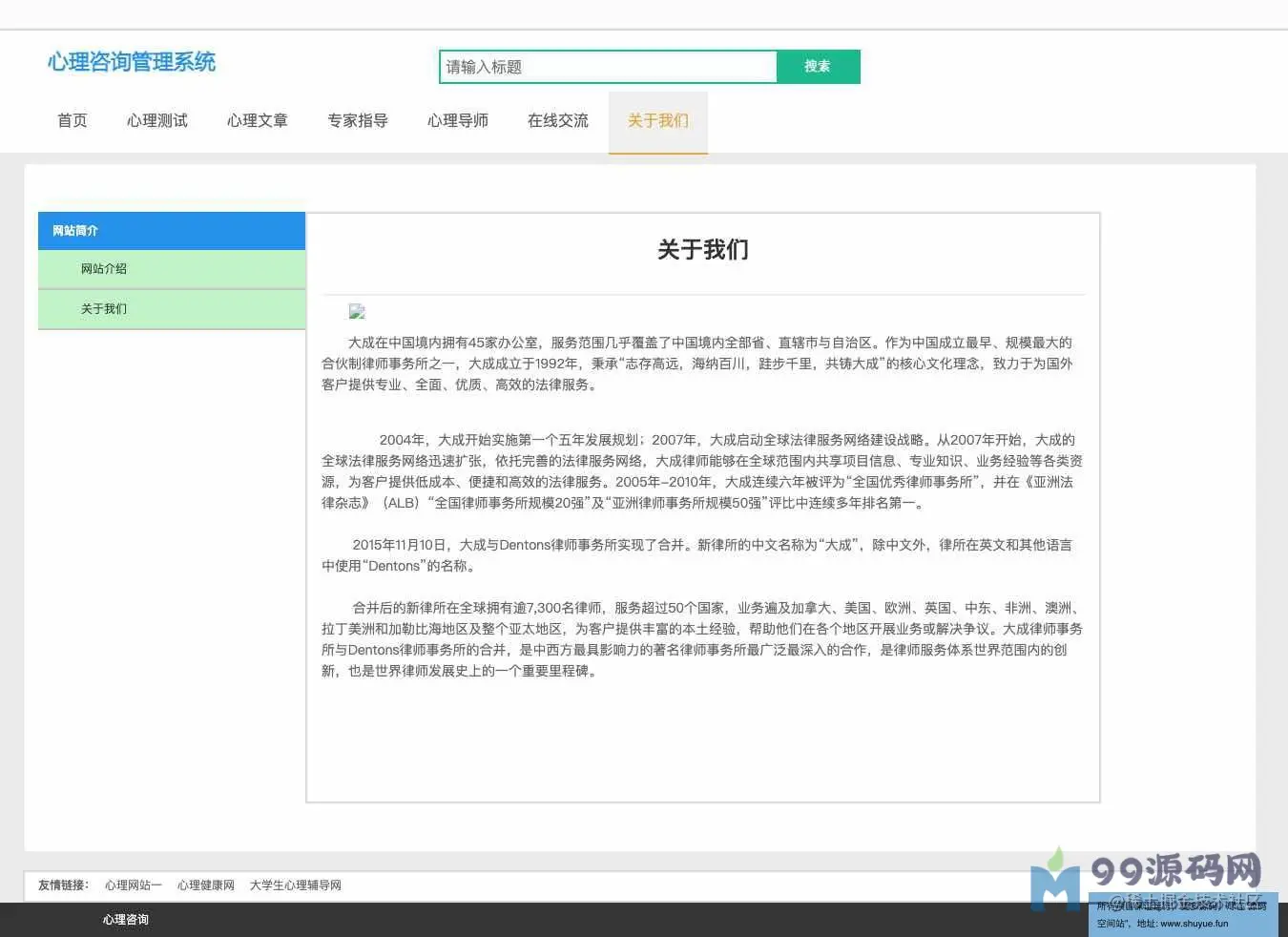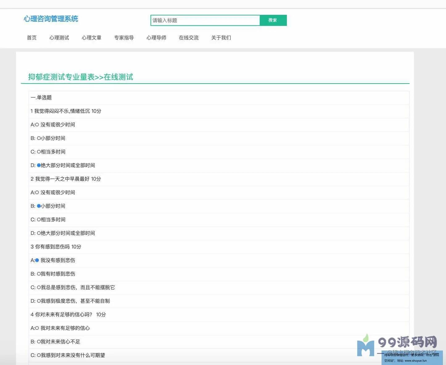 功能介绍 基于SSM校园心理咨询服务平台系统分为学生、教师、管理员三种角色,用户角色主要包括用户注册、用户登录、在线咨询、心理测试、论坛交流、账户维护等,教师角色主要包括教师登录、文章管理、在线回复等;管理员角色主要包括学生管理、教师管理、试题库管理、测试分类管理、试卷管理、新闻管理、网站介绍管理、会员评论管理、轮播图管理、友情链接管理、后台用户管理等最后根据详细设计的结果,运用JavaEE技术平台,使用更灵活的B/S开发模式和经典的SSM组合框架实现系统的MVC分层架构,并结合MySQL数据库实现了大学生心理减压网站的信息化管理。 环境需要 1.运行环境:最好是javajdk1.8,我们在这个平台上运行的。其他版本理论上也可以。 2.IDE环境:IDEA,Eclipse,Myeclipse都可以。推荐IDEA; 3.tomcat环境:Tomcat7.x,8.x,9.x版本均可 4.硬件环境:windows7/8/101G内存以上;或者MacOS; 5.是否Maven项目:否;查看源码目录中是否包含pom.xml;若包含,则为maven项目,否则为非maven项目 6.数据库:MySql5.7版本; 技术栈 1.后端:SpringSpringMVCMyBatis 2.前端:JSP+bootstrap+jQuery 使用说明 1.使用IDEA/Eclipse/MyEclipse导入项目,Eclipse/MyEclipse导入时,若为maven项目请选择maven;若为maven项目,导入成功后请执行mavenclean;maveninstall命令,下载所需jar包; 2.使用Navicat或者其它工具,在mysql中创建对应名称的数据库,并导入项目的sql文件; 3.将项目中db.properties配置文件中的数据库配置改为自己的配置 4.配置tomcat,然后运行项目,输入localhost:8080/xxx登录 5.管理员账户admin密码admin 教师账户:T001密码:123456 学生账户:2019031903密码:123456