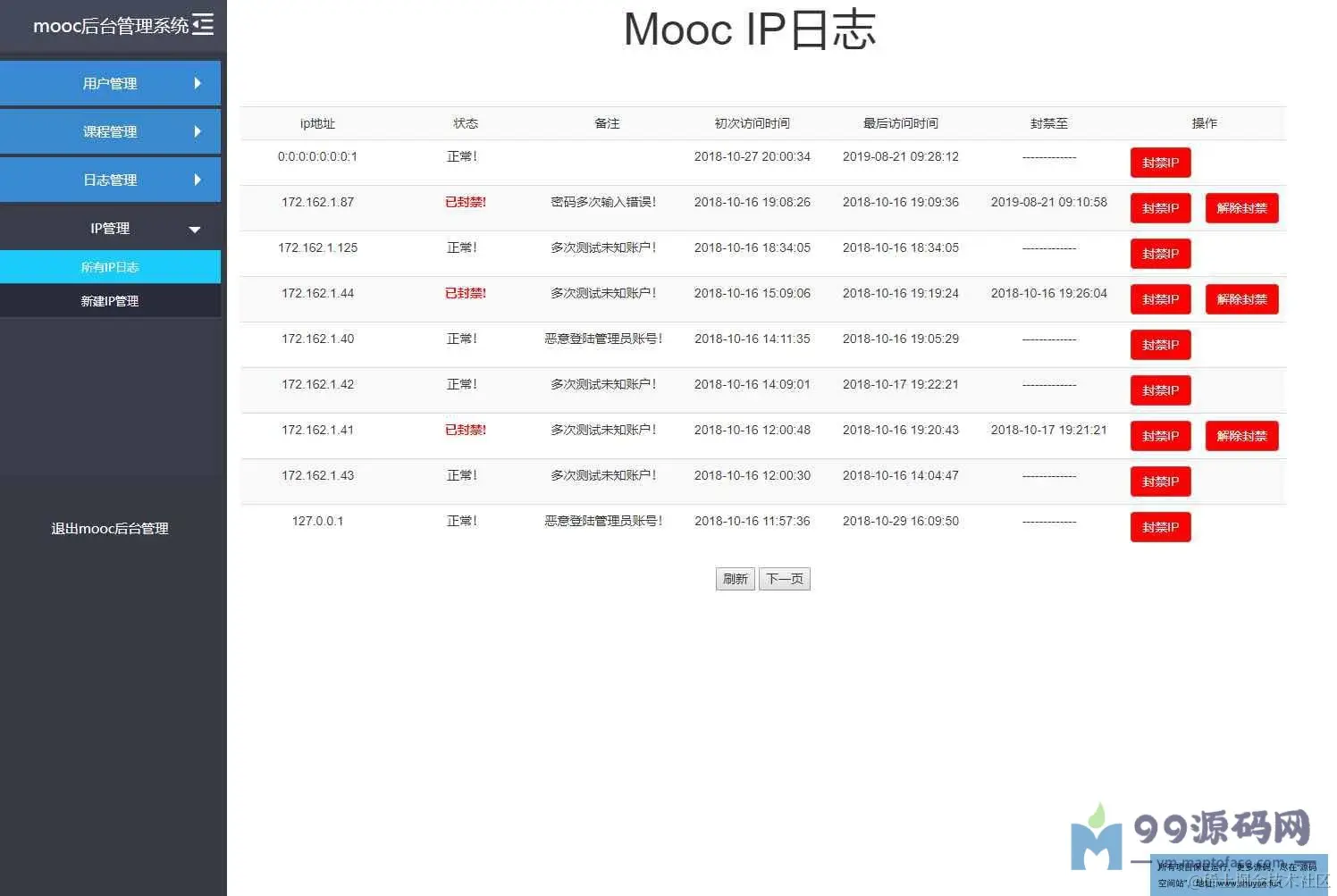本模块包括用户管理,作品信息管理等。 用户管理:提供管理员查询用户,锁定解锁用户,修正用户信息,充值余额。 课程信息管理:提供管理员增加删除修正功用。 系统日志查看:查看一切系统的动作信息。 访问ip管理:提供对访问IP的管理,能够停止拉黑IP等操作。