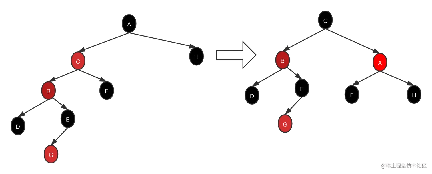 当父节点在祖父节点的右支上,以当前节点为轴进行右旋,将结构改为插入节点在右节点上,此时将问题转为插入节点在父节点的右支上,并且父节点在祖父节点的右支上
