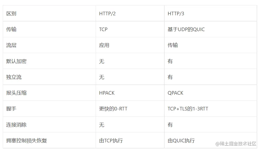 QUIC旨在通过减轻HTTP/2的数据包丢失和延迟问题来提高性能。虽然HTTP/2对每个数据来源使用单个TCP连接,但这会导致行头阻塞问题。例如,一个请求的对象可能会停滞在另一个遭受丢失的对象之后,直到该对象恢复为止。QUIC通过将HTTP/2的流层向下推送到传输层来解决此问题,从而避免了应用程序层和传输层的问题。HTTP/3还支持多路复用,在与TLS直接集成的同时,提供独立于其他连接请求的请求。尽管HTTP/2和HTTP/3的工作方式相似,但以下是HTTP/2和HTTP/3的一些重要区别。