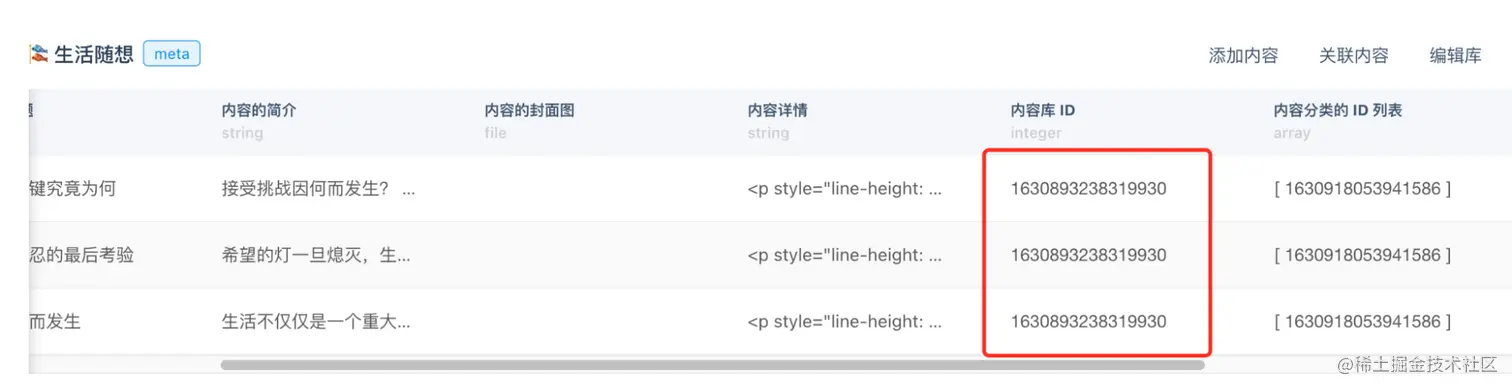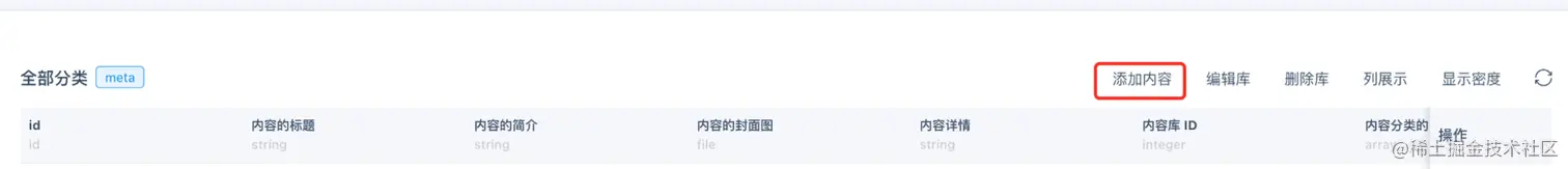 其中,contentGroupId 可以在控制台,创建一条内容后的内容列表获取。也可以通过点击内容列表左上方标题旁边的「meta」, 查看 contentGroupId 等信息,按需选用。