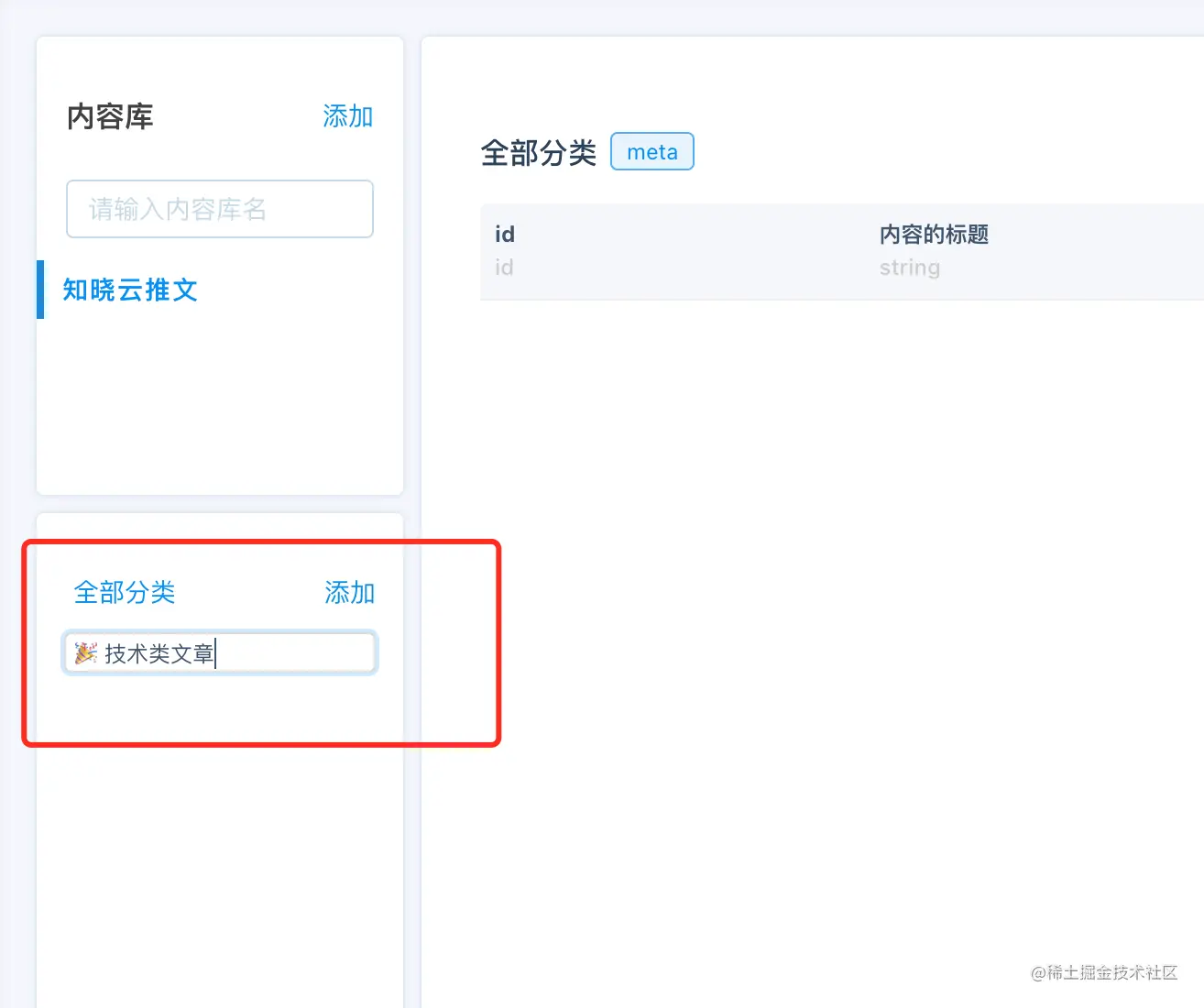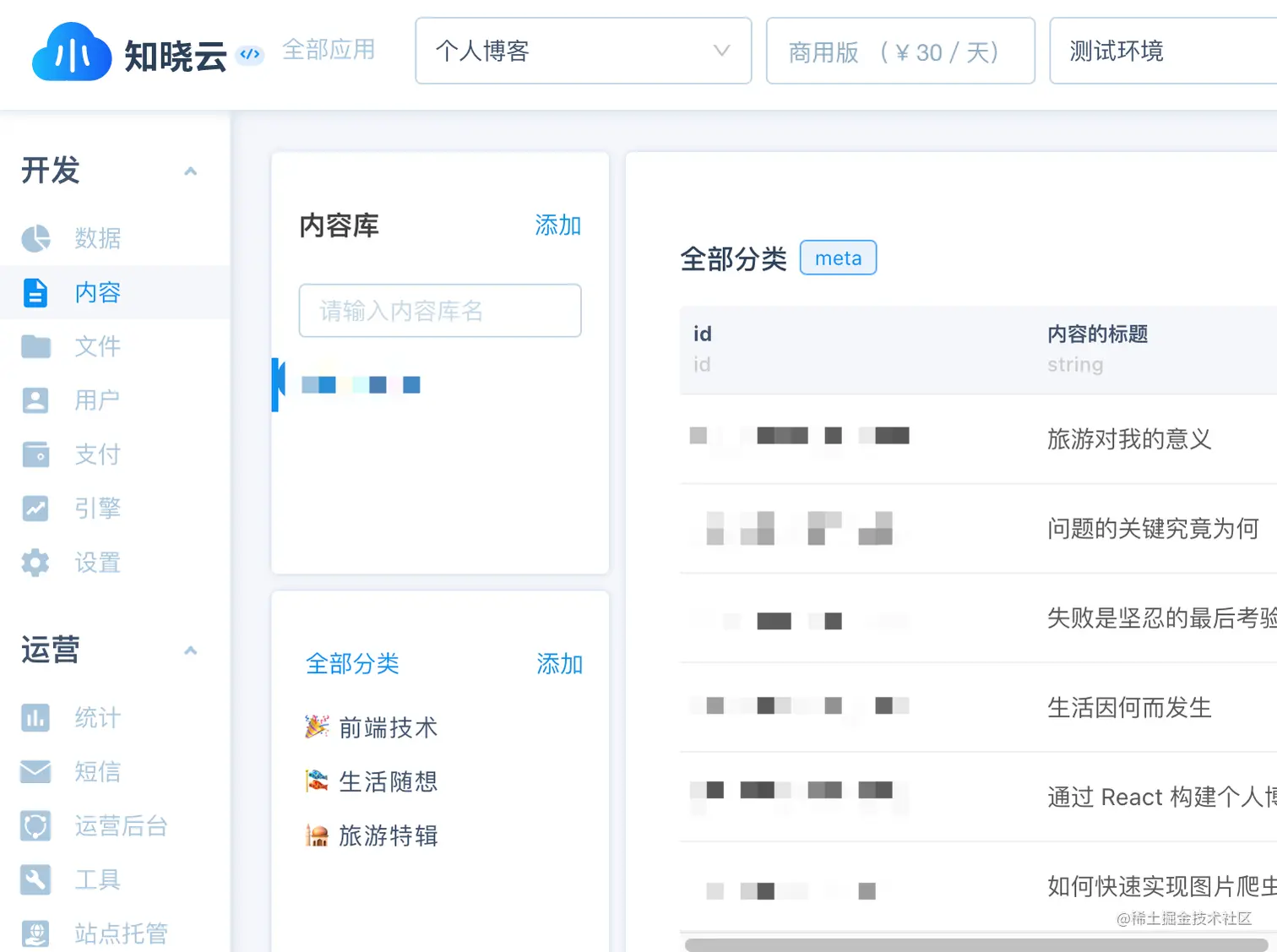 我们先在知晓云控制台左侧导航栏中点击「开发 - 内容」,进入内容库: