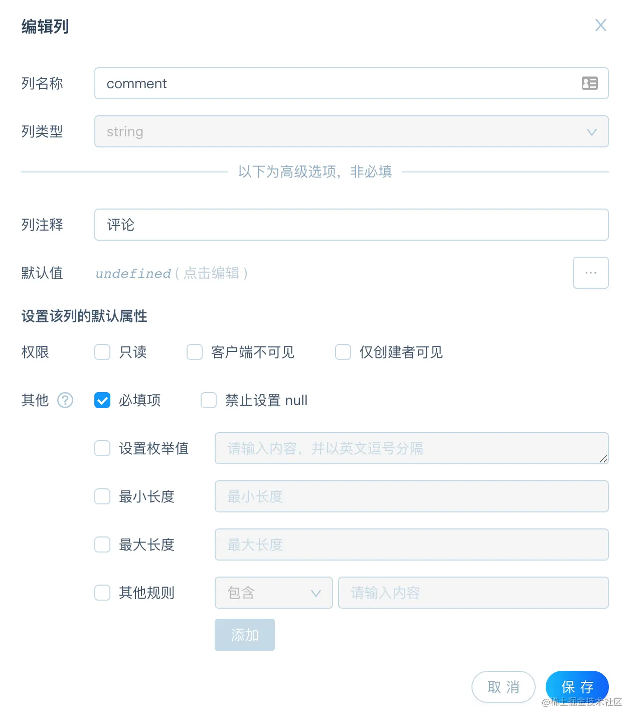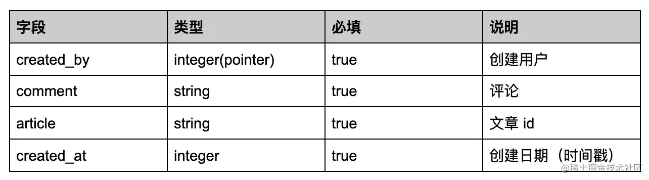 之后我们往 comment 表添加两个字段,分别是 comment 和 article。由于知晓云已经贴心地默认帮我们加上了 created_by 和 created_at 字段,这里便可略过。