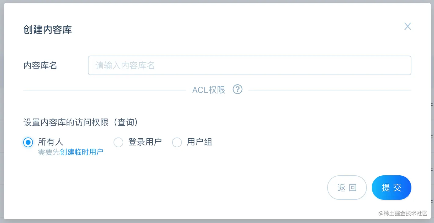 输入内容库名,将访问权限设置为所有人可见,并提交: