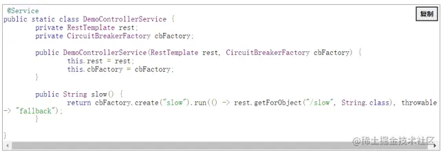 return cbFactory.create("slow").run(() -> rest.getForObject("/slow", String.class), throwable -> "fallback");