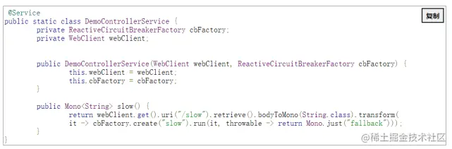 如果 Project Reactor 在类路径上,那么您也可以使用 ReactiveCircuitBreakerFactory 用于响应式代码。