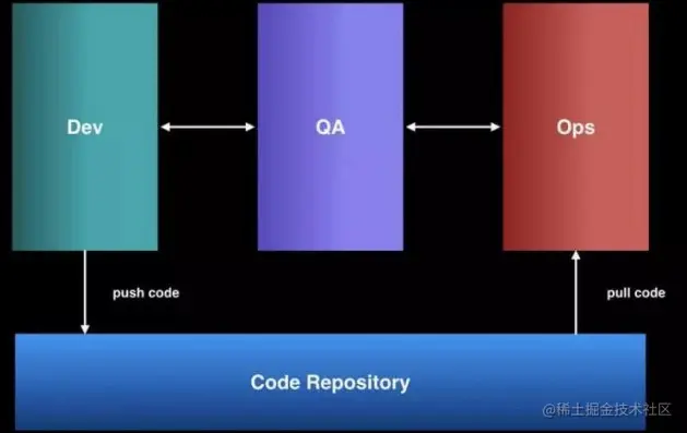 在传统的工作模式中,开发人员发布代码,测试人员进行测试,运维人员推广产品。这种模式的缺点是每个团队之间存在着很高的沟通成本,如下图所示。