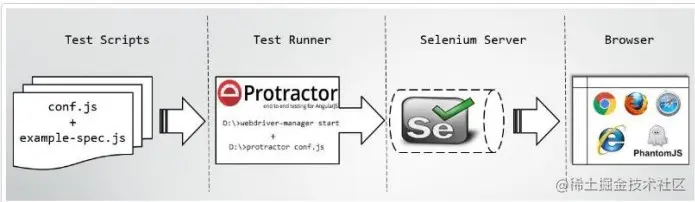 UI 测试的框架和工具很多,目前对于网页测试,最为常见的是“Protractor + Selenium Server + Jasmine测试框架”这个组合,过程如下图所示。