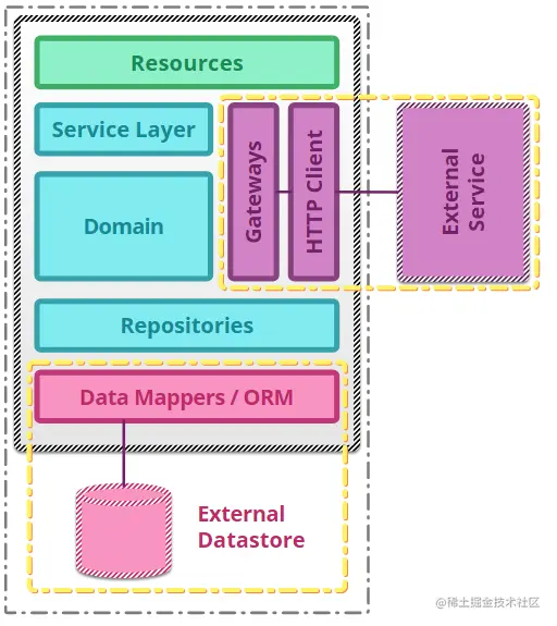 最常见的集成测试,是检查微服务对外的模块与外部服务的通信,以及与外部数据库的交互,即下图中用黄色虚线标出的部分。