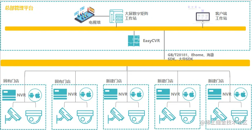 目前物流行业的网点多且分散,视频监控系统联网都是通过公网实现,各地门店的设备IP都是变动和随机的,总部管理中心和各级客户端无法直接访问IP动态变化的设备。因此,EasyCVR可通过GB/T28181协议、Ehome协议、厂家SDK等方式接入平台。