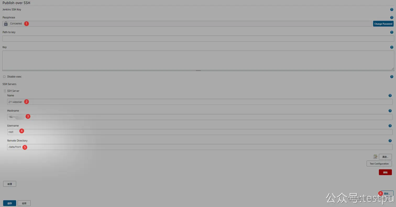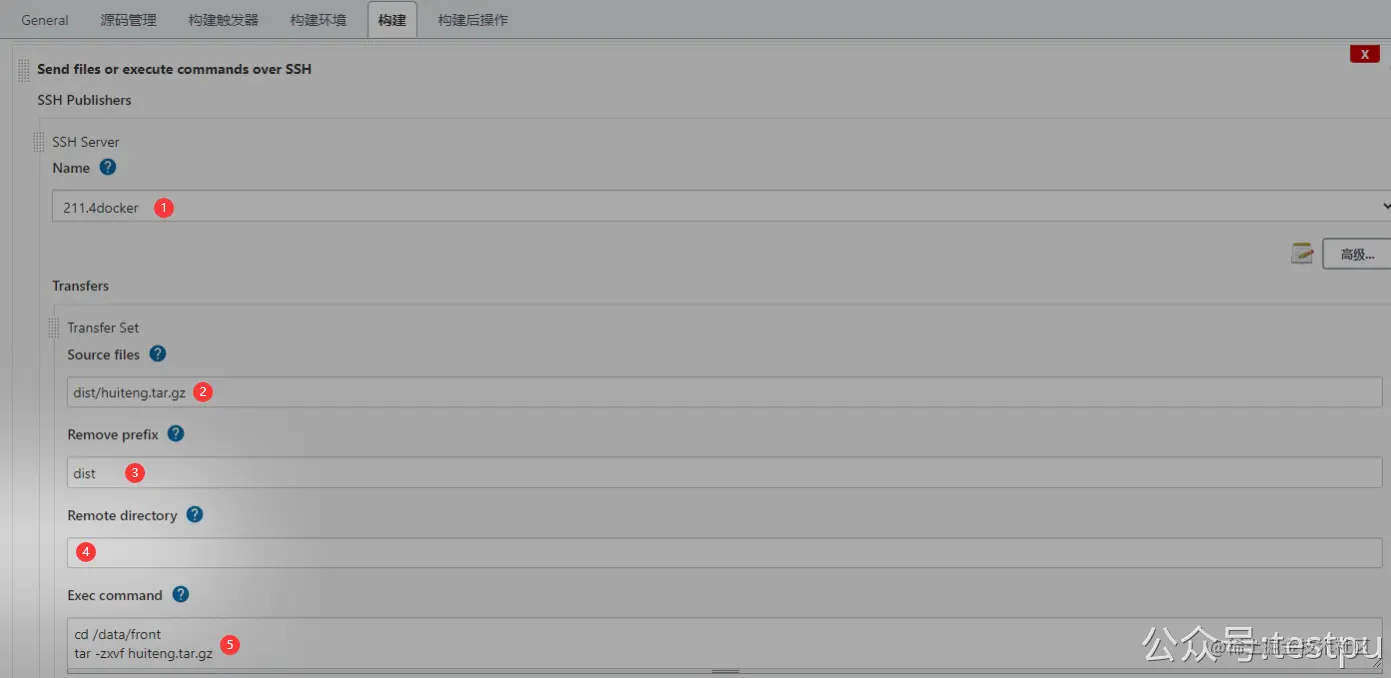 ④,远端目录,这里需要注意,我上面配置全局(公共配置)ssh的时候,已经填写了应用部署的远端目录,www.yuque.com/u21187464/c… 这里的第5个标记,此处是基于全局公共配置的目录的拼接。