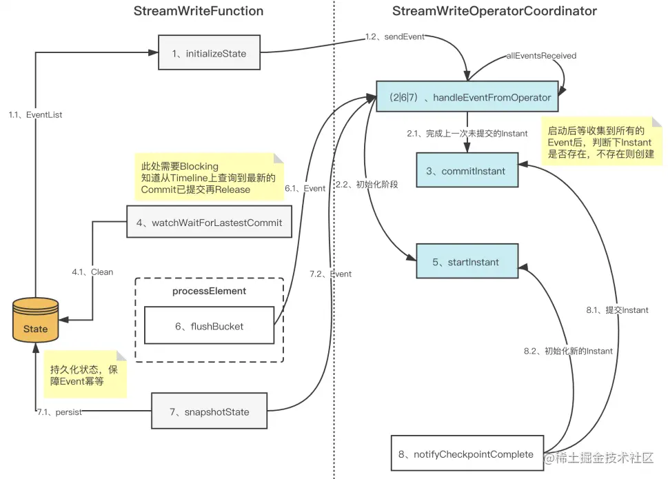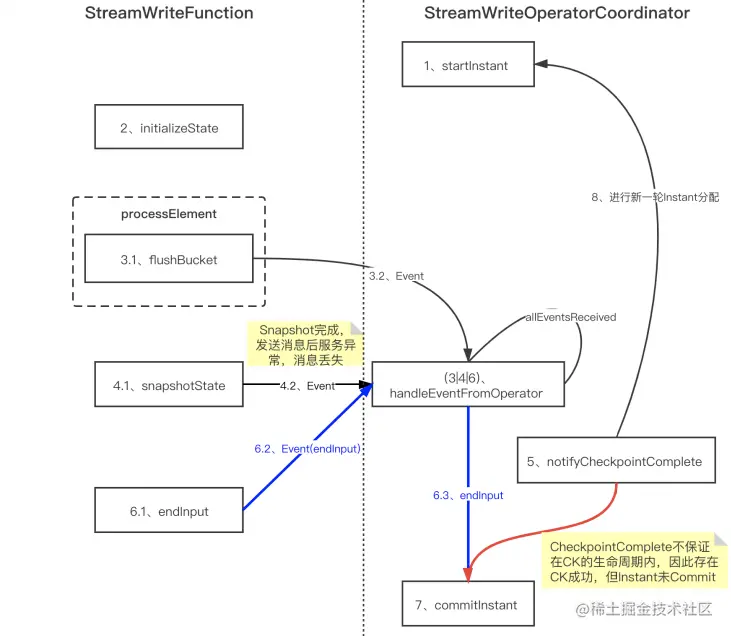 **问题:**CheckpointComplete不在CK生命周期内,存在CK成功但是instant没有commit的情 况,从而导致出现数据丢失。