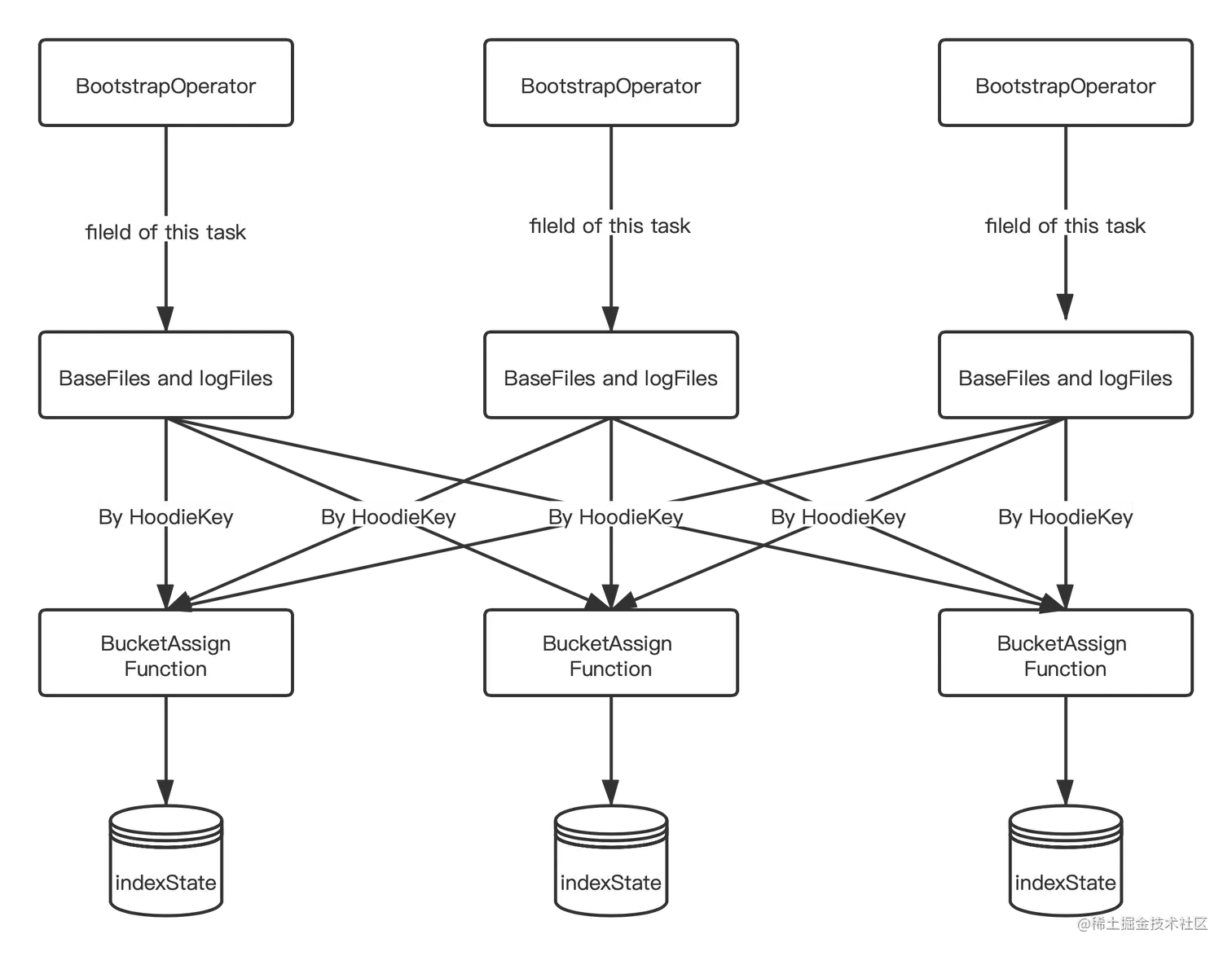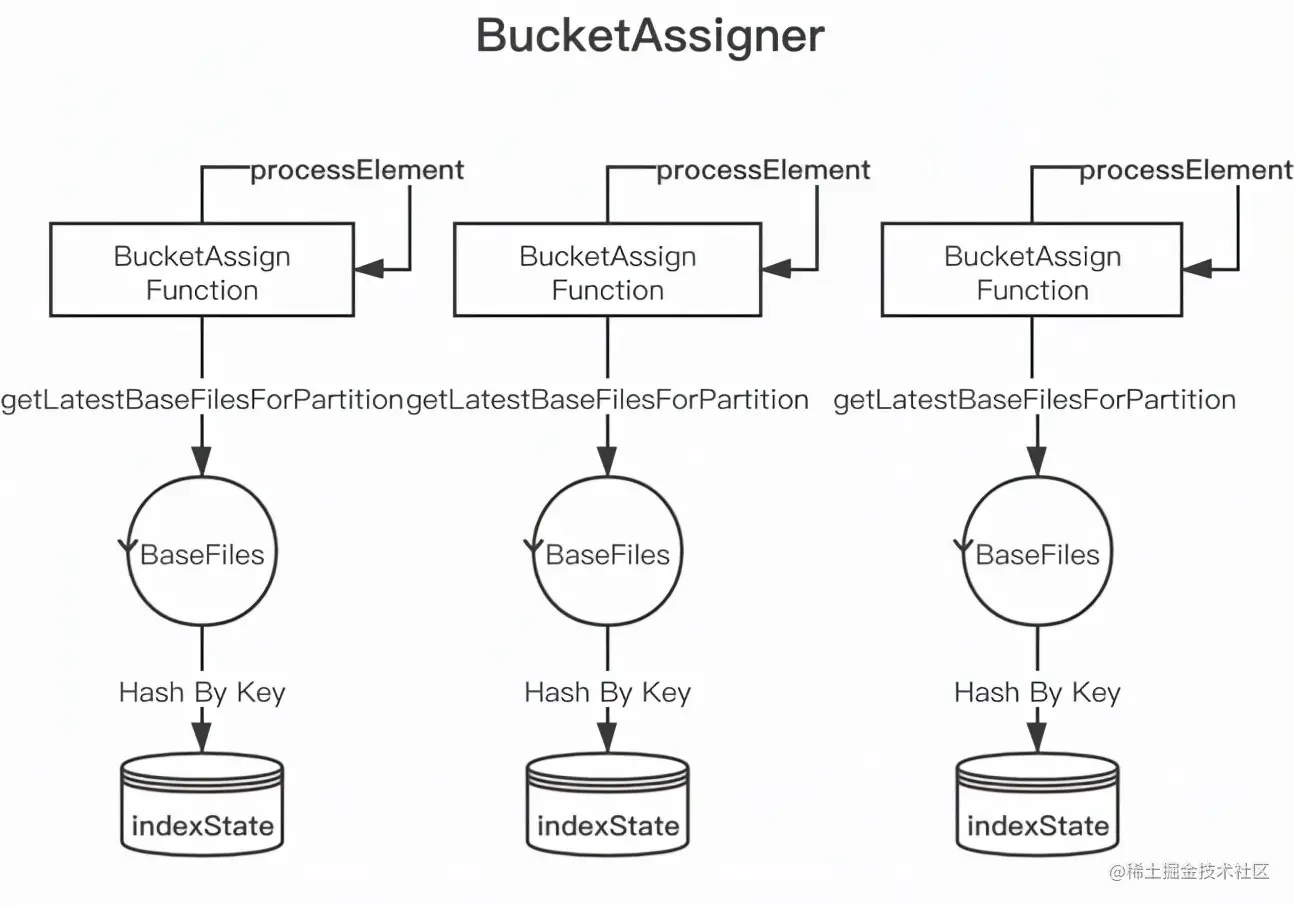 - 将 BaseFile 和 logFile 中的 recordKey 组装成 HoodieKey,通过 Key By 的形式发送给 BucketAssignFunction,然后将 HoodieKey 作为索引存储在 BucketAssignFunction 的 state 中。