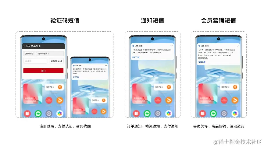 在“验证码短信”场景中,开发者可以利用短信服务发送验证码短信,实现用户注册登录、支付认证、密码找回等功能。