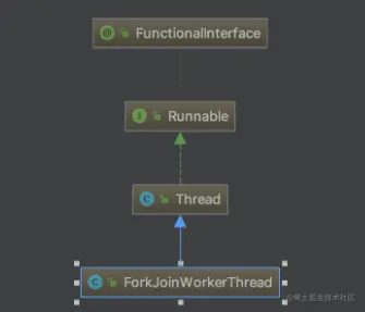 ForkJoinPool中执行的默认线程是ForkJoinWorkerThread,由默认工厂产生,可以自己重写要实现的工作线程。同时会将ForkJoinPool引用放在每个工作线程中,供工作窃取时使用。