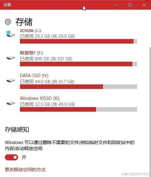 打开开始菜单,点击【设置】的图标,进入到设置界面后,依次点击【系统】-【存储】,接着在存储设置窗口中找到【存储感知】,将其开启即可。开启后每当系统监测到剩余空间不足时,会提醒用户通过删除不需要的文件(如临时文件和回收站中的内容)自动释放空间。