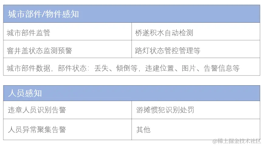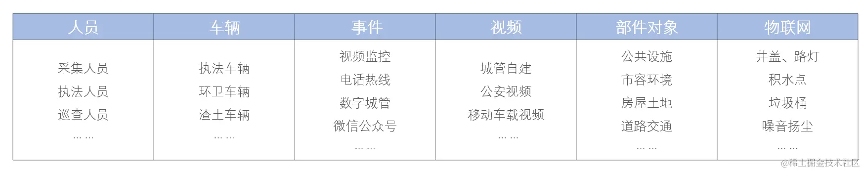 智慧城管的管理内容涉及到城市中的方方面面,为了方便管理,住建部将城市管理对象分为事件和部件两大类,事件包含市容环境类、宣传广告类、施工管理类、街面秩序类、突发事件类、其他事件类。部件则包含公用设施、交通设施、市容环境设施、园林绿化设施、房屋土地、其他部件。